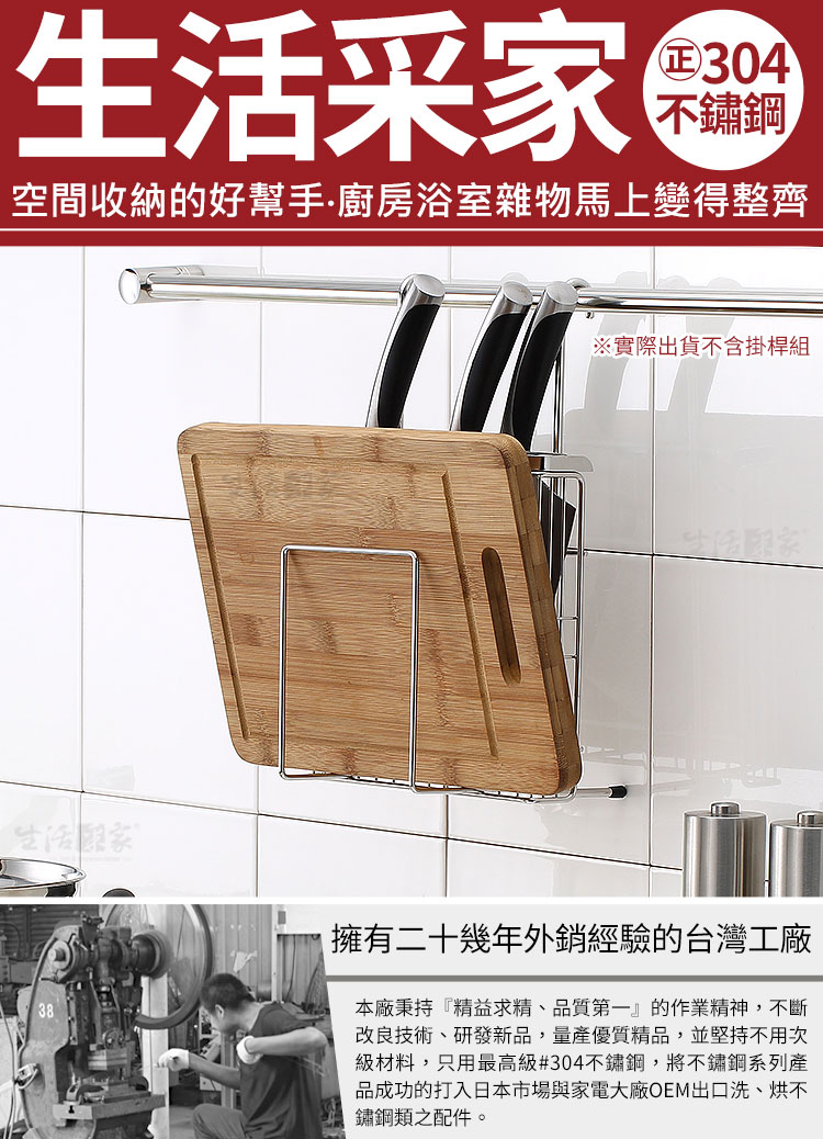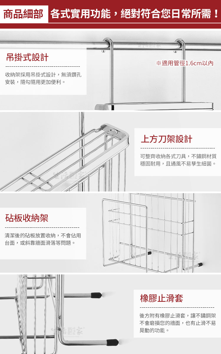 料理刀具無處放,擔心傳統櫥櫃不通風容易滋生衛生問題嗎?? ◆採18-8不鏽鋼材質,不會生鏽,容易清洗保養,經久耐用。 ◆不鏽鋼材不電鍍,直採採用不鏽鋼本色,長保如新,衛生可靠。 ◆安裝簡單,掛架採雙邊掛式設計,適用於直徑1.6cm以內的掛桿使用。 ◆刀具架分三層,可放大的3把及小的3把,各式料理用刀具通通都可擺放。 ◆前方砧板架間距5.7cm,不管是大塊、小塊或是厚型、薄型砧板通通都可擺放。 ◆清潔後的刀具、砧板或小物擺放風乾,不僅乾得快又不會有櫥櫃異味及衛生問題。