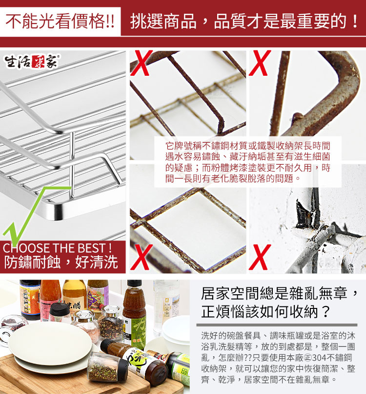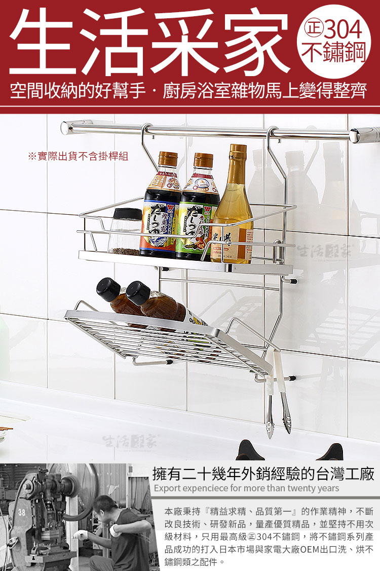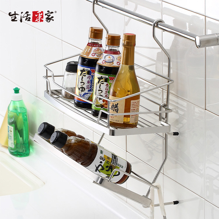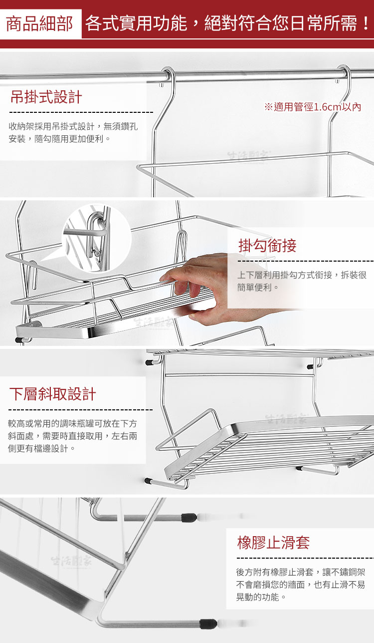 廚房收納空間大躍進,瓶瓶罐罐收納架讓您的廚房更井然有序!! ◆二層式設計,廚房、浴室通用,再多的調瓶瓶罐罐也不怕。 ◆下層採斜取式設計,料理時隨手一拿取用、置放都很便利。 ◆結構採勾掛式設計,免螺絲、免工具,組裝超簡單,拆洗也很方便。 ◆二層置放空間適合放置各式各樣瓶瓶罐罐,方便您隨時取用。 ◆採18-8不鏽鋼材質,不會生鏽,容易清洗保養,經久耐用。 ◆不鏽鋼材不電鍍,直採採用不鏽鋼本色,長保如新,衛生可靠。 ◆安裝簡單,掛架採雙邊掛式設計,適用於直徑1.6cm以內的掛桿使用。 ◆全品採不鏽鋼材質製造,不似塑膠材質易斷裂,耐用好清洗,不易藏污垢。