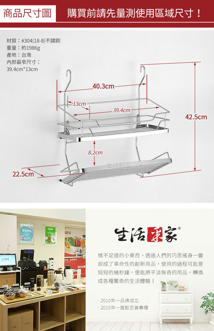 1.尺寸:約寬40.3*深22.5cm*高42.5cm 2.材質:#304(18-8)不鏽鋼 3.重量:約1.98kg(組) 4.產地:台灣 5.商品:掛式層架*1、斜取架*1、說明書*1