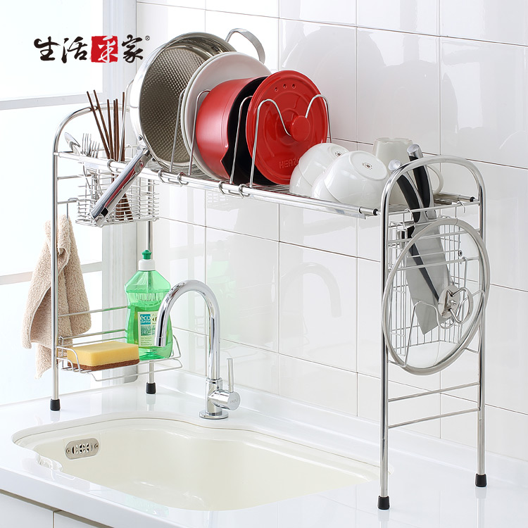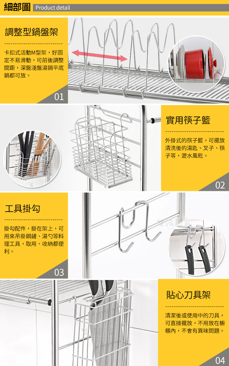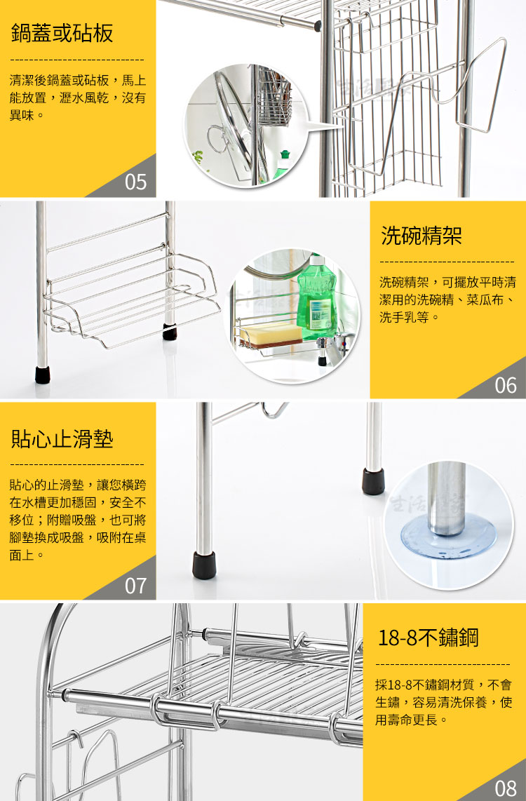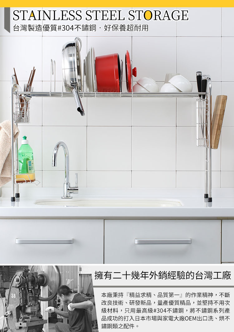 跨海大橋又來了!!收納功能超強,寬度可伸縮,配合您的廚房水槽或其它空間!! ◆內部高度增高為44.5cm,遇鵝頸式水龍頭也可使用。 ◆寬度可調整75.5~91.5cm,橫跨於水槽上,清洗瀝水更便利。 ◆附盤架、筷籃、刀架、洗碗精架、鍋蓋砧板架、雙掛勾等配件。 ◆採18-8不鏽鋼材質,不會生鏽,容易清洗保養,經久耐用。 ◆不電鍍,直接採用不鏽鋼本色,不殘留重金屬,使用安全可靠。 ◆有別於其它市售機種,全架均採#304(18-8)不鏽鋼材,品質保證。 ◆清洗後可將物品直接跨置於水槽上方滴水風乾,不會有櫥櫃異味問題。 ◆腳柱處採加高型設計,可閃過大部份水龍頭,不會影響清洗時的手部動作。 ◆層架的四個腳可依安裝處狀況選擇使用原本腳墊或改用加附的吸盤。 ◆附有盤架、筷籃及獨特的洗碗精架,實用功能多更多,您不能錯過的好幫手。