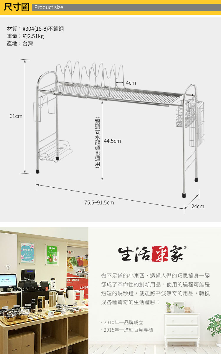 1.尺寸:約寬75.5~91.5cm*深24cm*高61cm 2.材質:#304(18-8)不鏽鋼 3.重量:約2.51kg(組) 4.產地:台灣 5.商品:ㄇ型主架*1、M型盤架*1、筷籃*1、刀架*1、洗碗精架*1、鍋蓋砧板架*1、雙掛勾*1、吸盤*4、腳墊*4