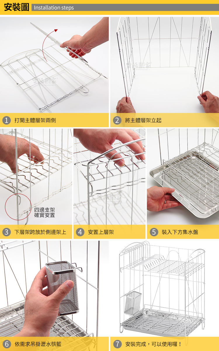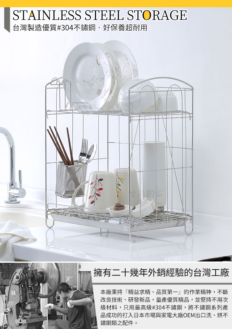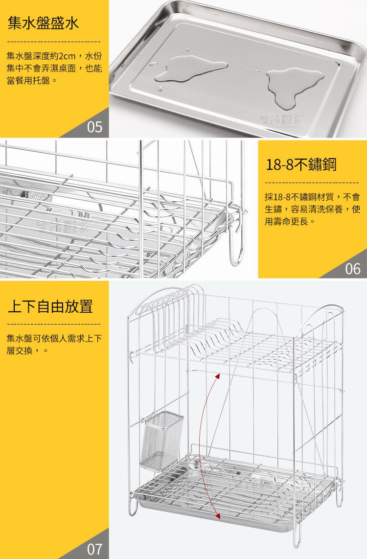 廚房洗完的碗盤、筷子無處風乾嗎?瀝水盤裝不了其它東西嗎?? ◆二層式收納層,可放杯子、飯碗、餐盤、蔬果、杯子等。 ◆採18-8不鏽鋼材質,不會生鏽,容易清洗保養,經久耐用。 ◆不電鍍,直採採用不鏽鋼本色,不殘留重金屬,安全可靠。 ◆豪華型配備,兼具各項收納與瀝水功能,一機多用絕對划算。 ◆附筷筒、清潔後的筷子、湯匙等可擺放風乾不會有櫥櫃異味。 ◆瀝水盤可依個人使用習慣或需要,安裝在上層或下層。
