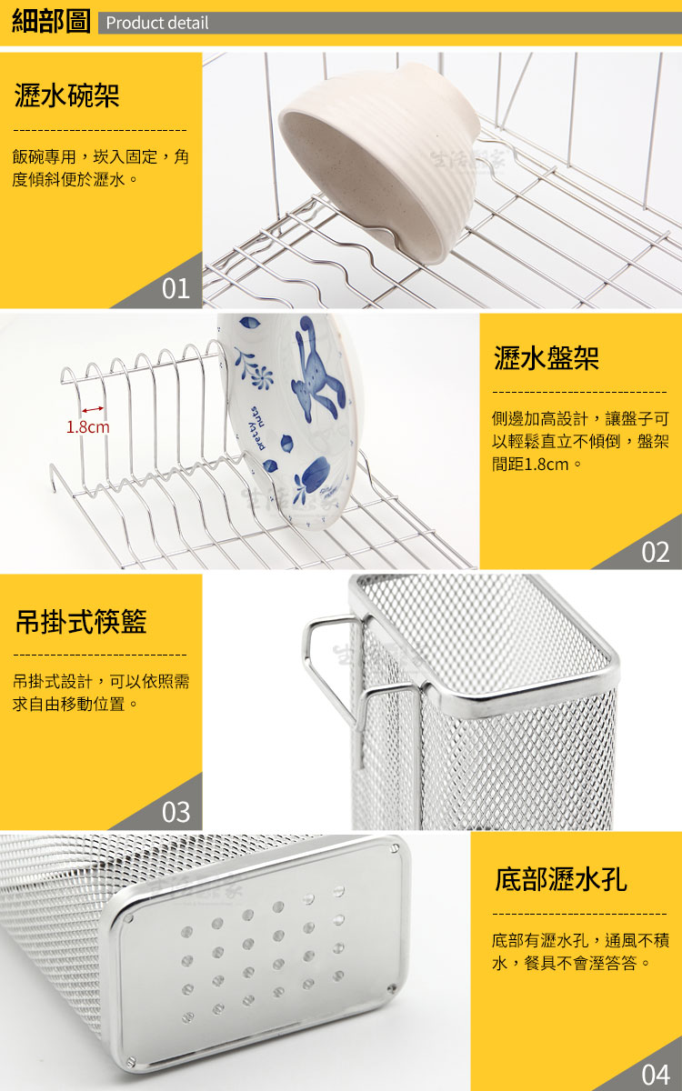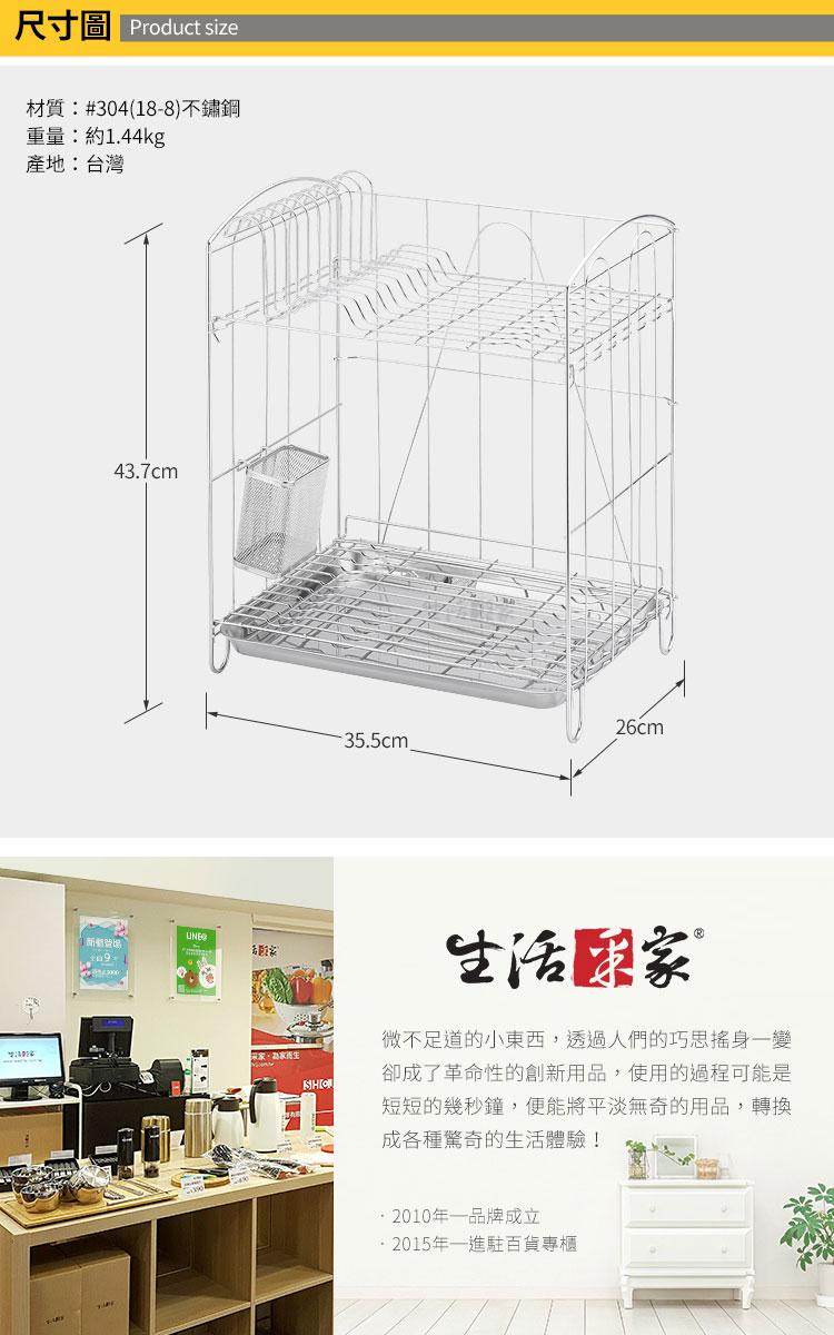 1.尺寸:約長35.5cm*寬26cm*高43.7cm 2.材質:#304(18-8)不鏽鋼 3.重量:約1.44kg 4.產地:台灣 5.商品:組合式瀝水架*1、瀝水盤*1、筷筒*1