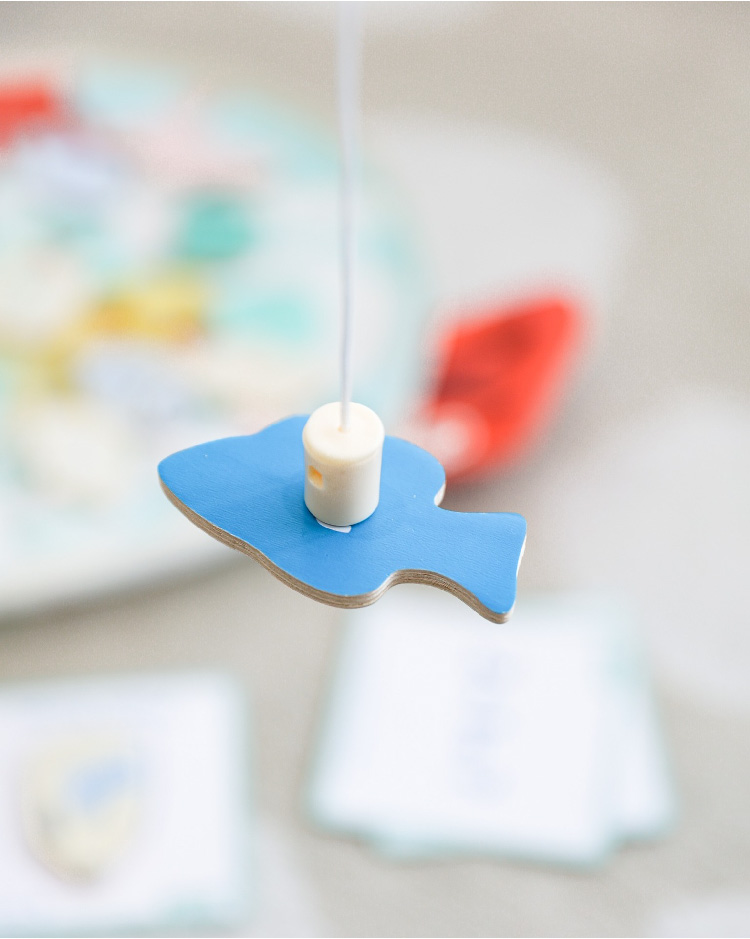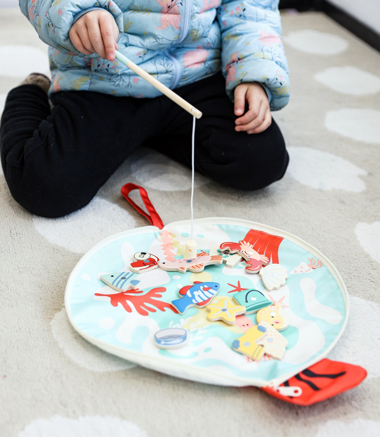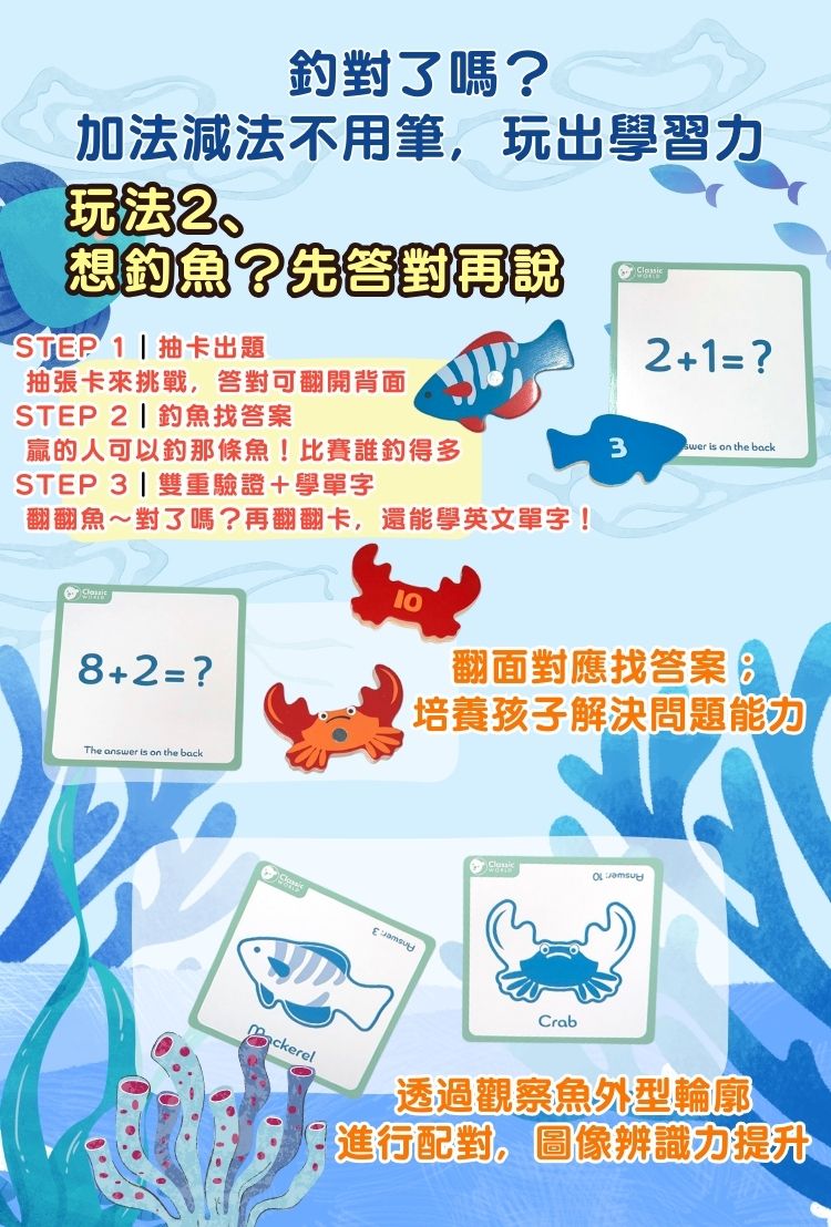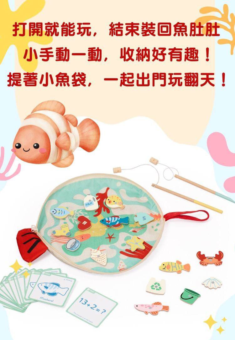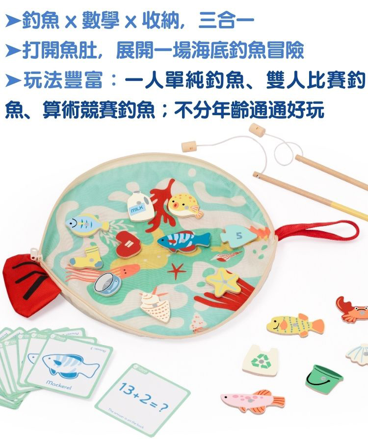 🐟開袋即玩、玩完剛好裝回魚肚肚 🐟布製魚池,拉起來就是可愛收納袋 🐟訓練手眼協調、數字認知與分類能力 ➤魚形收納包:提把到頭尾約50 x16 x1(厚) 公分 ➤布製魚池攤開(圓形):約34×34 公分 ➤題卡:約9 x9公分(紙製)/共16張 ➤磁性魚配件:3.5×8.4×5 ~ 4×6.5×5不等【共16塊】 ➤釣竿:0.6 x0.6 x20 公分【共2支】