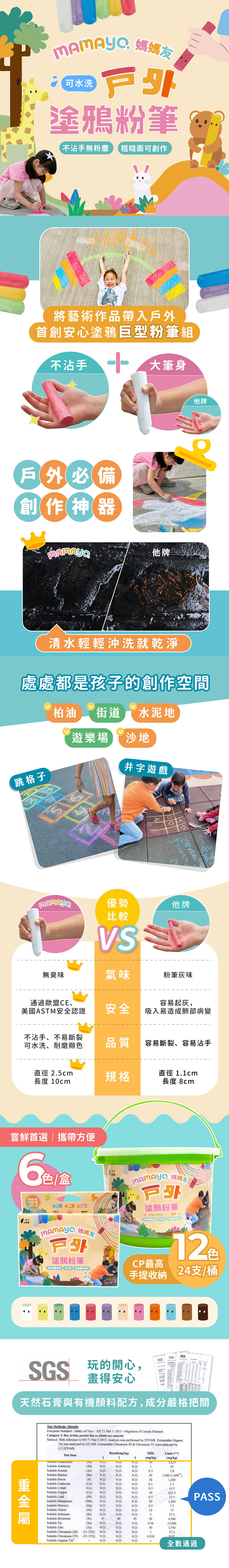 |媽媽友mamayo戶外可水洗塗鴉粉筆| 戶外塗鴉神器,整枝筆都能用! .台灣製造、天然石膏與有機顏料配方 通過SGS、美國ASTM安全認證,不含有害重金屬成分。 .加粗筆身2.5cm,不容易斷裂、耐磨又顯色 相較於傳統粉筆又脆又容易斷裂,mamayo塗鴉粉筆好抓握好使力,色彩又飽和。 .不沾手、不易掉屑、輕鬆水洗 塗鴉時毋須煩惱粉筆揚灰,手上畫完也保證能夠乾乾淨淨  清潔與注意事項: 1.使用清水刷拭粉筆跡即可。 2.請勿置於火爐旁、陽光直射或高溫處。 3.請勿置於幼兒易取處以防吞食