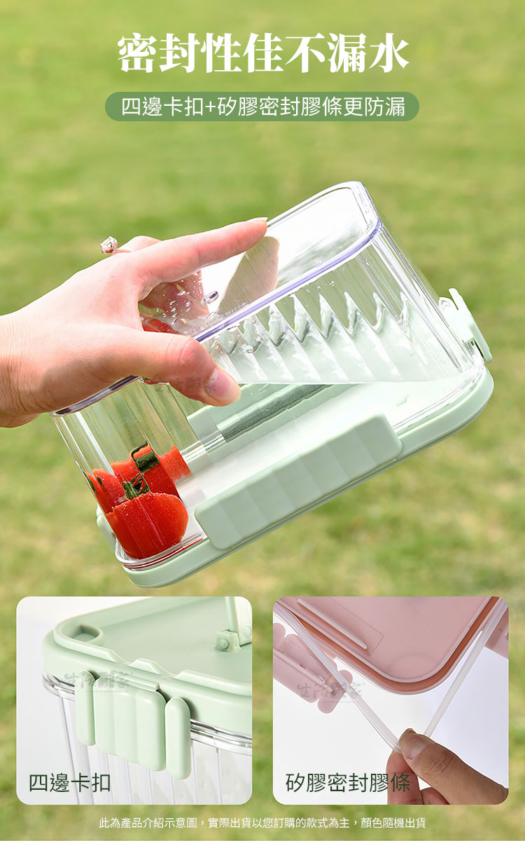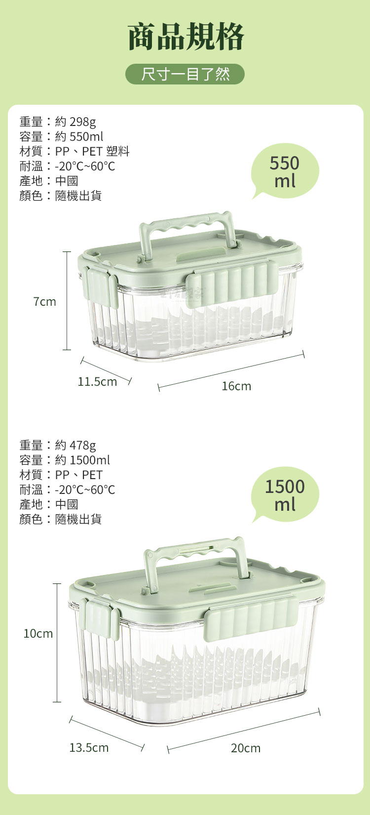 【生活采家】自帶冰磚密封瀝水保鮮盒550ml(三色隨機)#77004 1.尺寸:約W16*L11.5*H7cm 2.材質:本體-PP、PET塑料;密封圈-矽膠 3.耐溫:-20℃~60℃ 4.容量:約550ml 5.重量:約298g/個 6.產地:中國 7.商品:保鮮盒*1、冰磚*1 8.顏色:綠、米白、粉三色隨機出貨