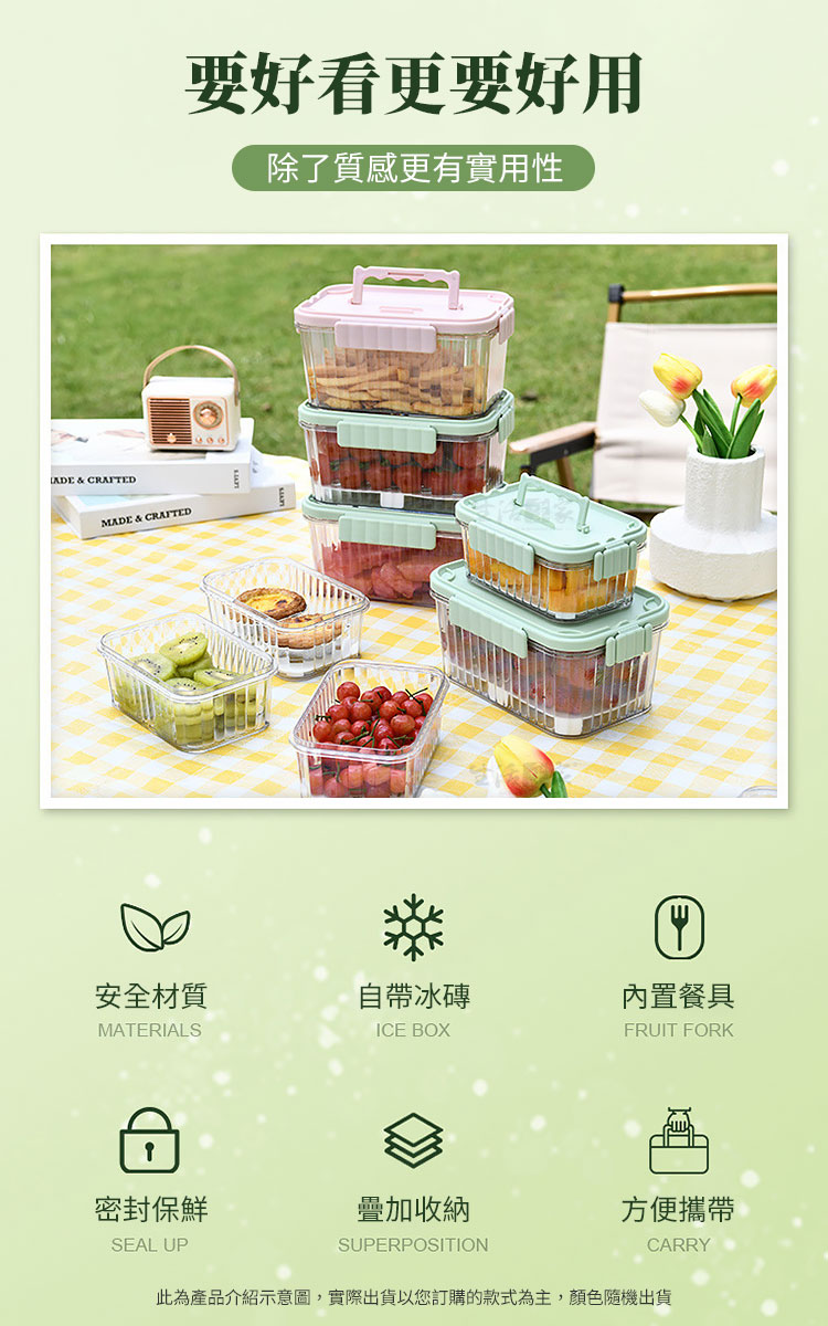 🌟為什麼要使用它? 🌡️ 冰磚保鮮:真正的保鮮高手,低溫保鮮能保持食材新鮮,不怕食材失去風味。 💦 瀝水小幫手:多餘的水分自動流出,食材不泡爛,保持食材的水嫩口感。 🍽️ 滿足多變需求:而且它多功能,可以用來冷藏、冷凍、攜帶、堆疊收納!