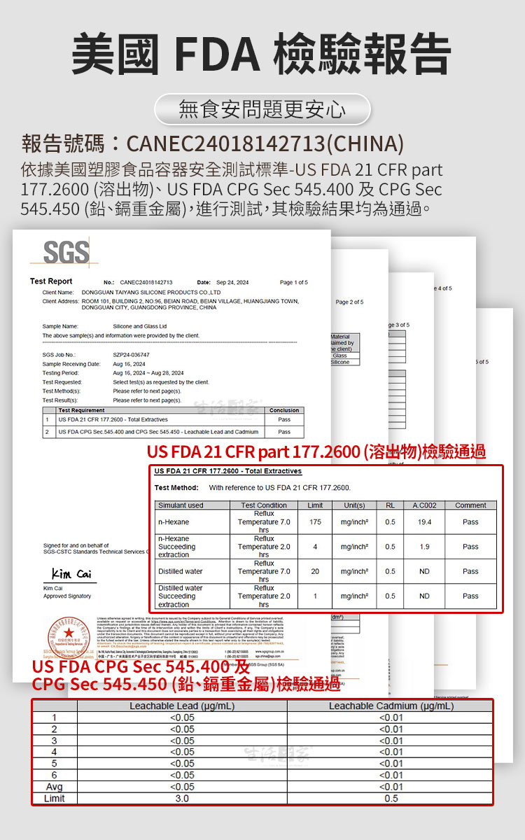 🔹 通過美國FDA檢驗(報告號碼:CANEC24018142713)CHINA 經SGS檢驗機構依據美國塑膠食品容器安全測試標準-US FDA 21 CFR part 177.2600 (溶出物)、 US FDA CPG Sec 545.400 及 CPG Sec 545.450 (鉛、鎘重金屬),進行測試,其檢驗結果均為通過,使用安全無虞。