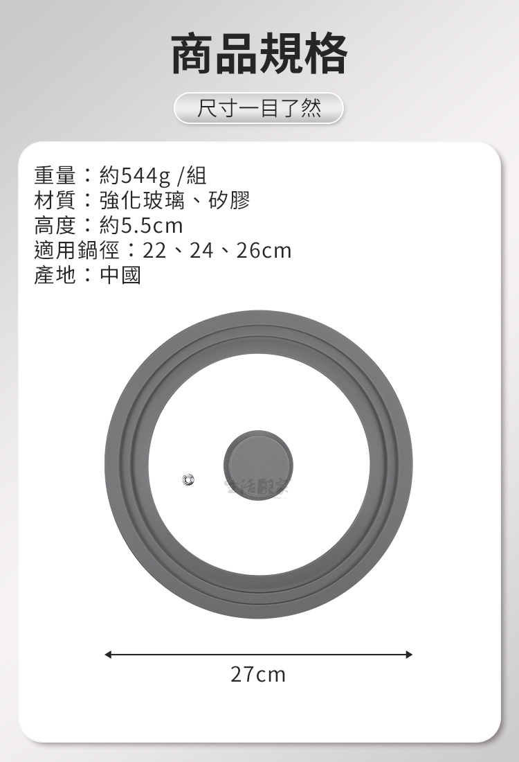 1.尺寸:約直徑27*高5.5cm 2.材質:矽膠、強化玻璃 3.重量:約544g/組 4.產地:中國 5.適用:22cm/24cm/26cm鍋具