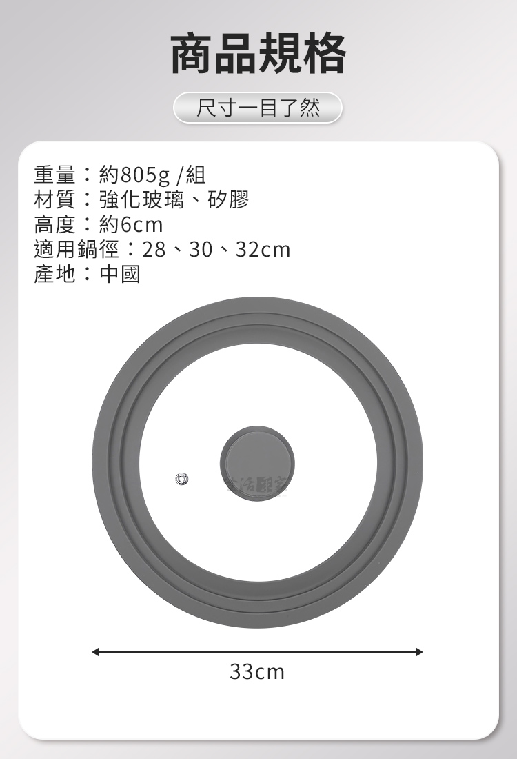 1.尺寸:約直徑33*高6cm 2.材質:矽膠、強化玻璃 3.重量:約805g/個 4.產地:中國 5.適用:28cm/30cm/32cm鍋具