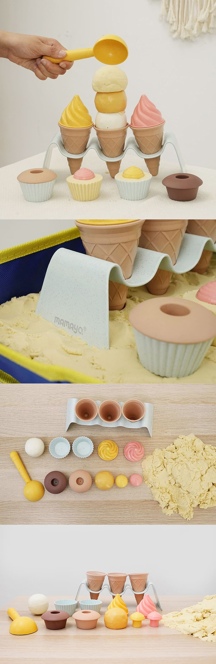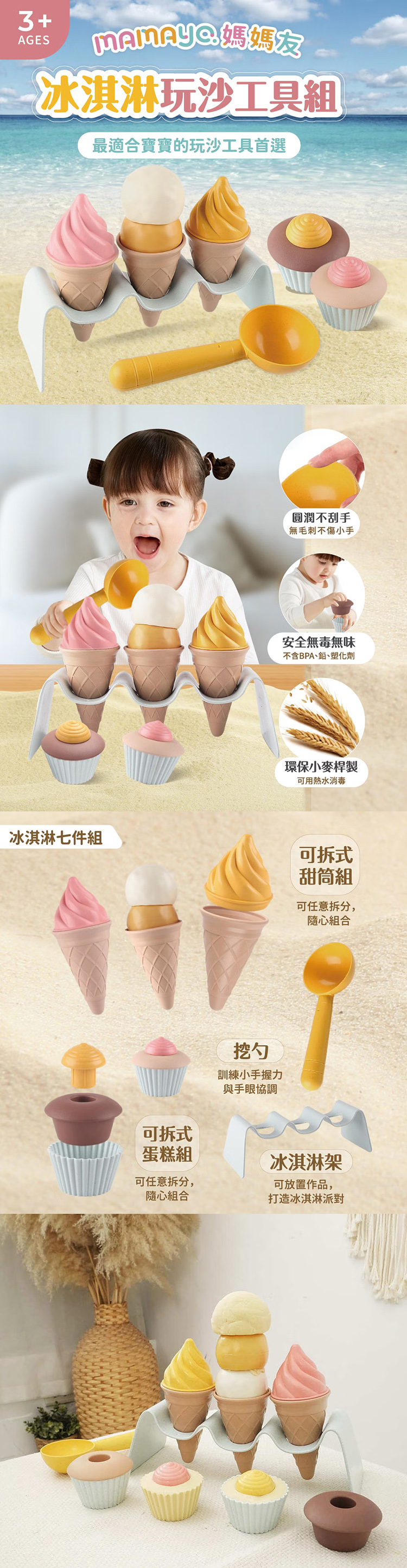 組合內含挖勺一件、冰淇淋三件(可拆)、蛋糕兩件(可拆)、冰淇淋架一件,滿足孩子的各種創意需求。 這些工具經由團隊測試不僅耐用,而且能讓孩子在玩耍中發揮無限創意,學習與探索,希望這款產品能成為每個家庭玩沙時的必備夥伴。
