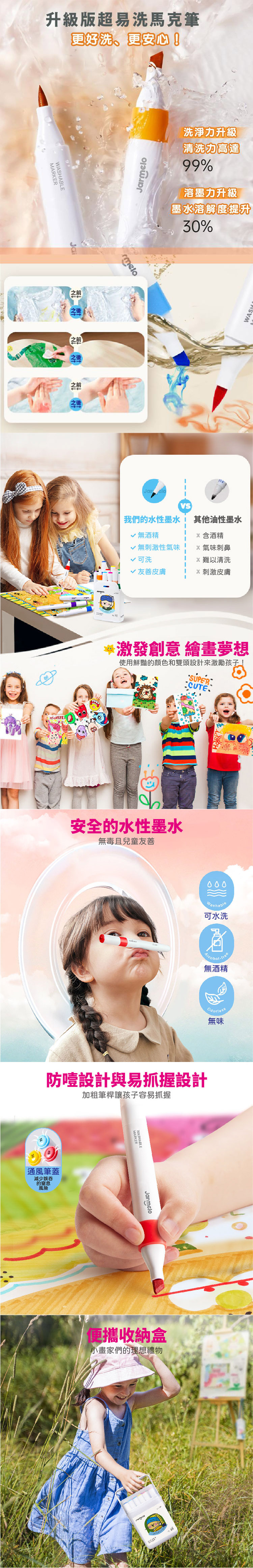 馬克筆+尖頭軟毛筆,一支抵多隻,依角度多種畫法,塗、寫、勾、畫流暢好用 ! 可水洗/無味/無酒精 遇水速溶,可水洗性高達95%+ 加粗筆桿讓孩子容易抓握 色彩飽滿鮮豔,發揮無限創意 歐盟CE/美國AP雙認證