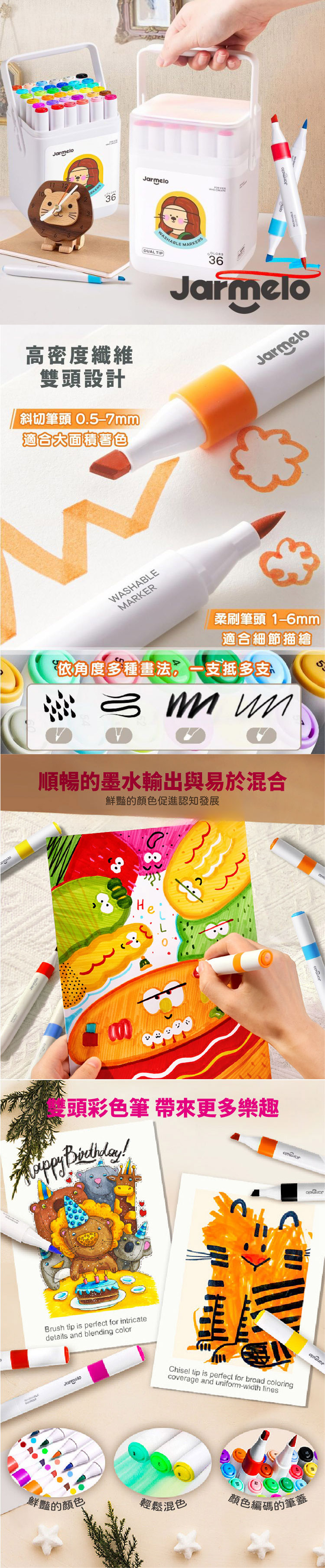 【品名】可水洗雙頭彩繪塗鴉馬克筆(36色) 【材質】植物性顏料、塑膠 【年齡】3歲以上 【尺寸】10× 11.5 X16.5 公分 【重量】764 公克 【產地】中國 【安全標章】CE, AP 【BSMI】M33851