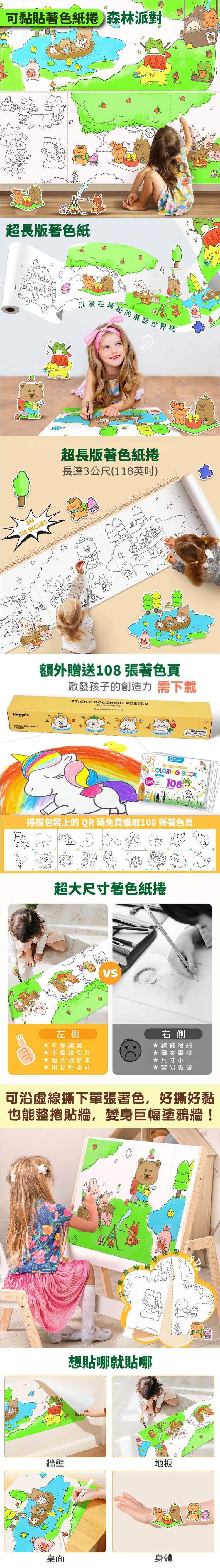 《可黏貼設計|像便利貼一樣貼牆就能畫》 不黏手、不殘膠、不打結,好撕不費力 隨時貼、隨時撕,牆面無負擔 《分段撕取好方便》 長度300公分,每50公分有虛線裁切設計 想分段著色、單張使用都沒問題! 《整捲貼上牆,秒變『巨幅塗鴉牆』》 一次貼滿整面牆,創作無限延伸 超適合派對佈置、主題教室、親子活動 《高品質紙材,滑順不易破》 適用彩色筆、色鉛筆、水彩、絲滑蠟筆等多種畫筆 紙張強韌、不起毛、不易破 《畫完還能剪下來DIY》 可當孩子專屬貼紙或手作素材 製作剪貼本、拼貼卡片都超實用