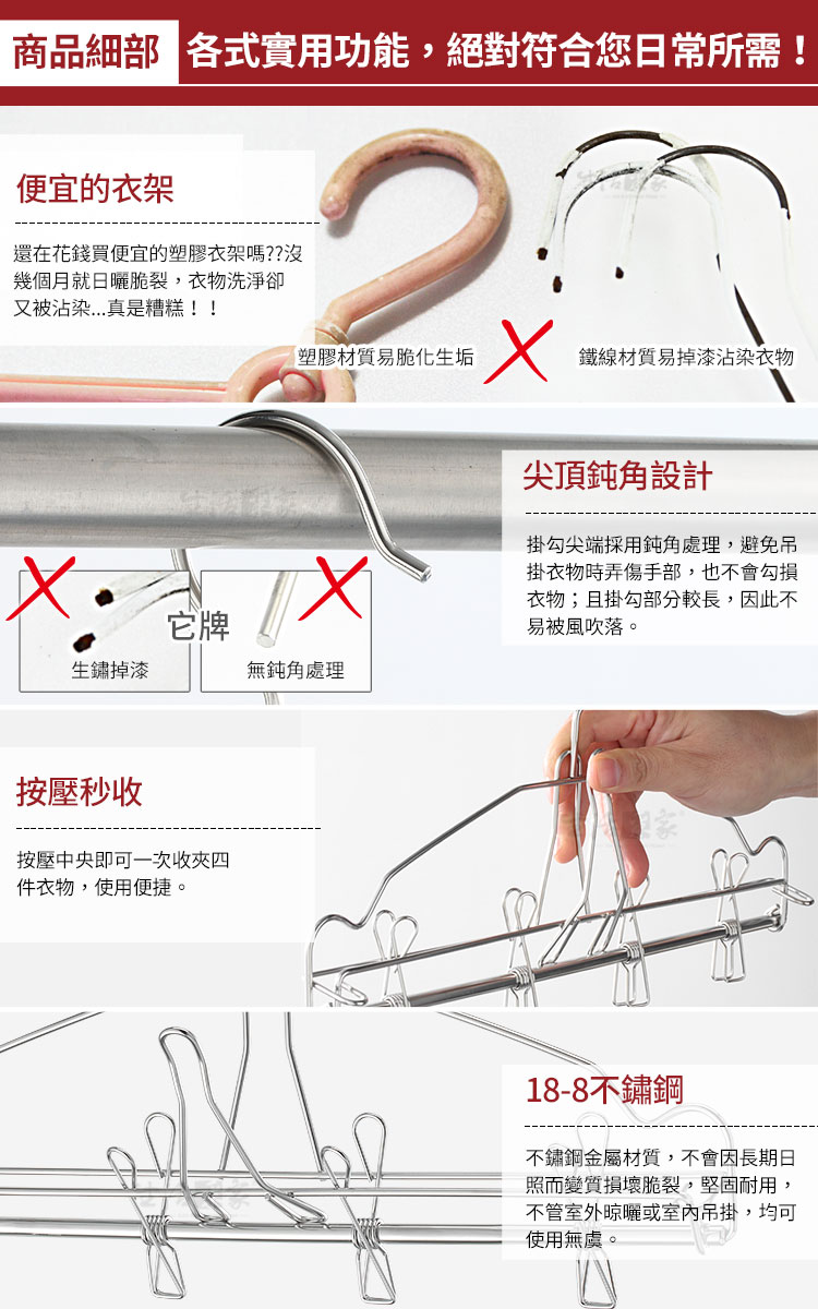 還在買199元的塑膠曬衣架嗎?沒一個月就日曬脆裂,真糟糕!! ◆台灣創新研發,專利商品(新型第M555181號)。 ◆台灣製商品用料實在,秒收界的高級品。 ◆秒收秒放,輕輕一按即可快速收衣服。 ◆一支4夾,可多支衣架不同位置搭配使用。 ◆不鏽鋼材物理性動力傳動,久用不會喪失功能。 ◆全機304不鏽鋼,不會生鏽,容易清洗保養,經久耐用。 ◆鋼材不電鍍,直採採用不鏽鋼本色,不殘留有害重金屬。 ◆掛在室外不會因長久日照而變質損壞脆裂, 使用壽命更長。 ◆夾數4夾,適用於單身或少量用戶,掛曬襪類、衣物、手套、領巾等。