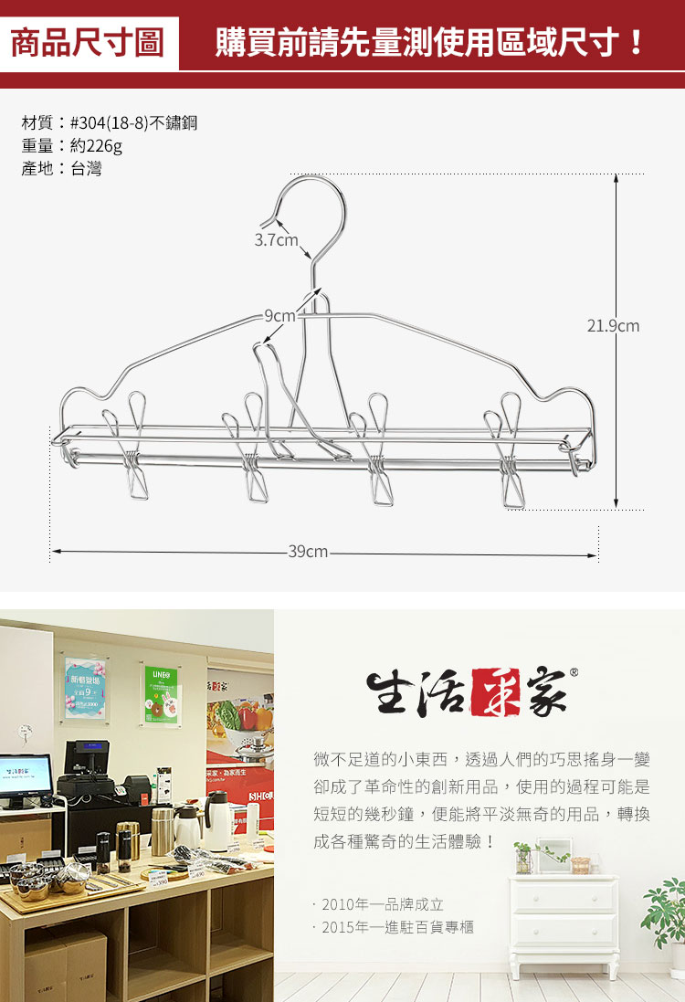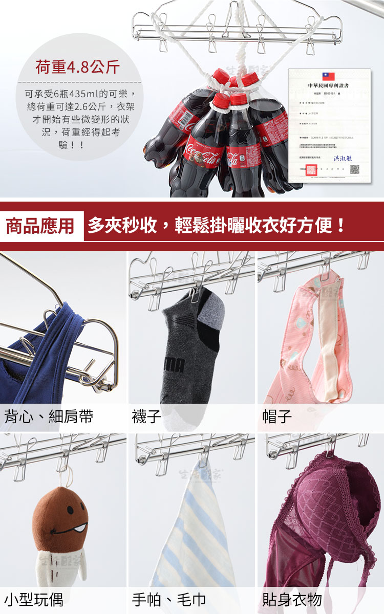 1.尺寸:約長39*寬9*高21.9cm 2.材質:#304(18-8)不鏽鋼 3.重量:約226g(組) 4.產地:台灣 5.夾數:4夾 6.應用:小型衣物室內室外晾曬使用 7.專利:新型第M555181號