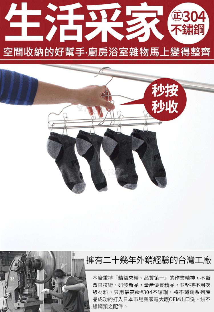 台灣自製優良商品又來了,外銷國外的優質商品,現在有機會在國內就可以買到了!! 每次收衣服時,總是要花時間一個一個拆下來嗎?20夾要拆20次,30夾就要拆30次,拆得腰都酸了~不僅費時費力,還折騰了自已的身體!不過有了【生活采家秒收系列衣架】只要輕輕一 按,衣服一次幫你收下來,迅速收衣省了一件一件拆收的困擾,晾曬衣物更加輕鬆快速、省時省力。擁有二十幾年外銷經驗,商品深受歐美日等地區肯定,堅持不用次級材料,只選用正統高級#304(18-8)不鏽鋼,品質好不會生鏽,絕對是您的不二選擇!!