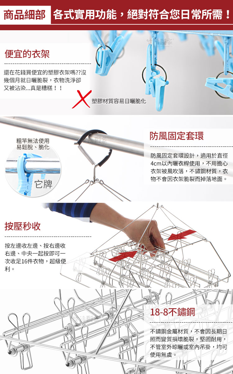還在買199元的塑膠曬衣架嗎?沒一個月就日曬脆裂,真糟糕!! ◆台灣創新研發,專利商品(新型第M555181號)。 ◆台灣製商品用料實在,秒收界的高級品。 ◆秒收秒放,輕輕一拉即可快速收衣服。 ◆使用時可雙邊秒收衣物,也可以單邊秒收衣物。 ◆不鏽鋼材物理性動力傳動,久用不會喪失功能。 ◆中間區域可夾各式衣物,側邊還可晾曬毛巾,一機多用。 ◆掛勾處加裝防滑塑膠套管及彈簧,風大時也不易掉落。 ◆全機304不鏽鋼,不會生鏽,容易清洗保養,經久耐用。 ◆鋼材不電鍍,直採採用不鏽鋼本色,不殘留有害重金屬。 ◆掛在室外不會因長久日照而變質損壞脆裂, 使用壽命更長。 ◆夾數16夾,適用於中用量用戶,掛曬襪類、衣物、手套、領巾等。