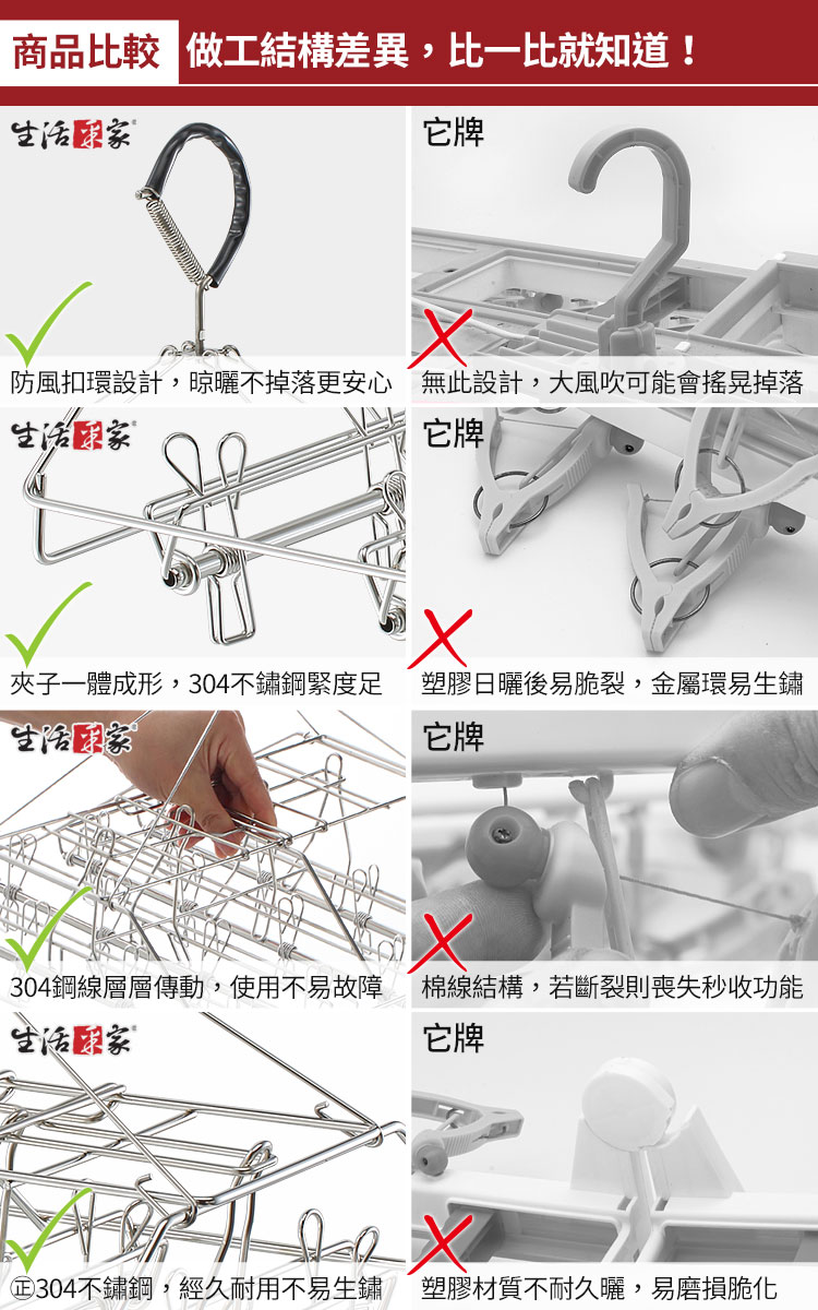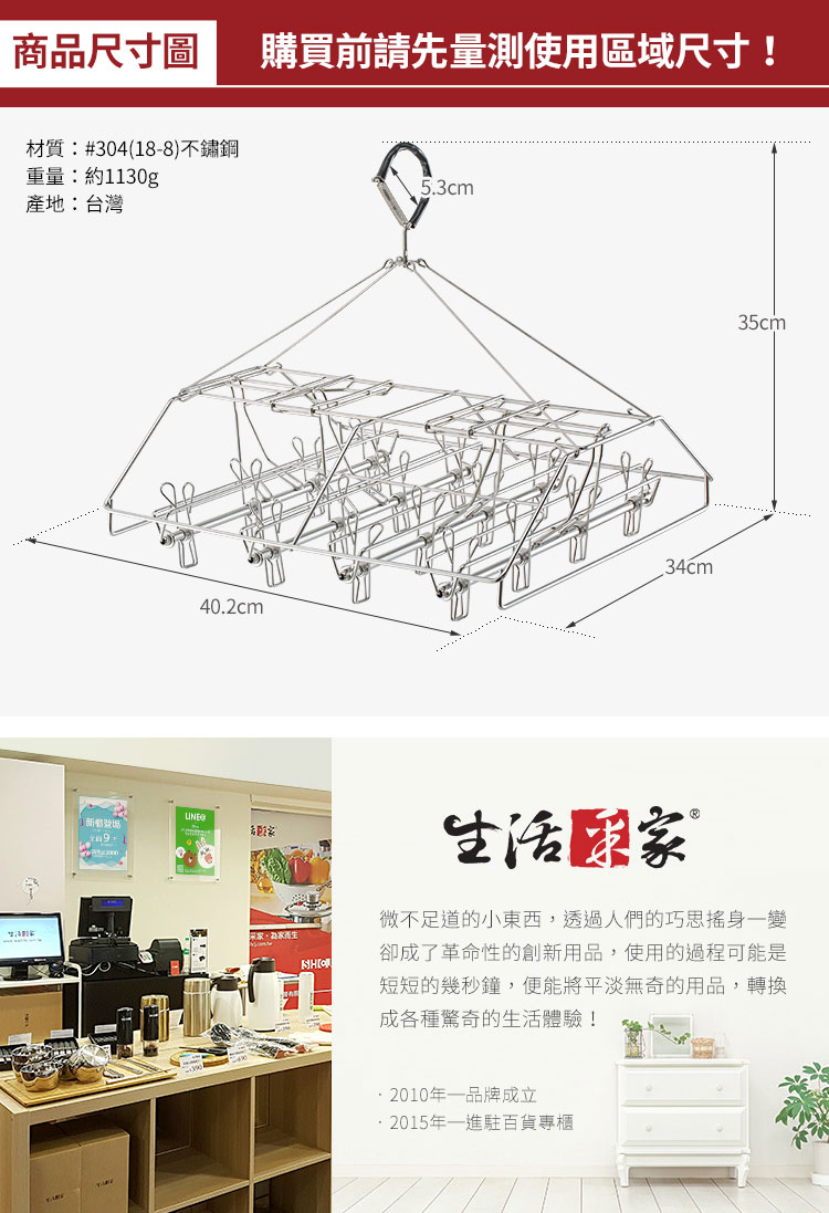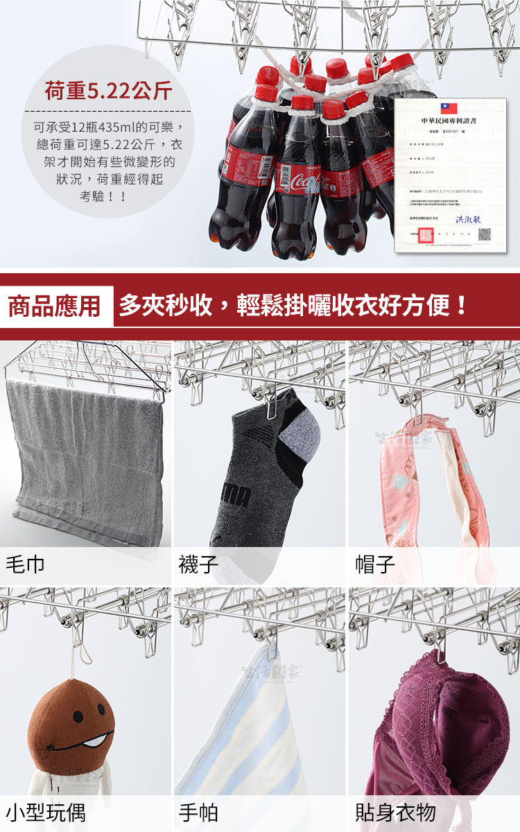 1.尺寸:約長40.2*寬34*高35cm(展開時) 2.材質:#304(18-8)不鏽鋼 3.重量:約1.13kg(組) 4.產地:台灣 5.夾數:16夾 6.應用:小型衣物室內室外晾曬使用 7.專利:新型第M555181號