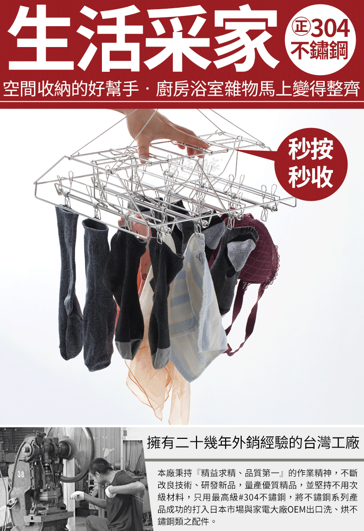 台灣自製優良商品又來了,外銷國外的優質商品,現在有機會在國內就可以買到了!! 每次收衣服時,總是要花時間一個一個拆下來嗎?20夾要拆20次,30夾就要拆30次,拆得腰都酸了~不僅費時費力,還折騰了自已的身體!不過有了【生活采家秒收系列衣架】只要輕輕一拉,衣服一次幫你收下來,迅速收衣省了一件一件拆收的困擾,晾曬衣物更加輕鬆快速、省時省力。擁有二十幾年外銷經驗,商品深受歐美日等地區肯定,堅持不用次級材料,只選用正統高級#304(18-8)不鏽鋼,品質好不會生鏽,絕對是您的不二選擇!!