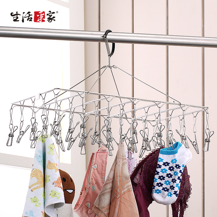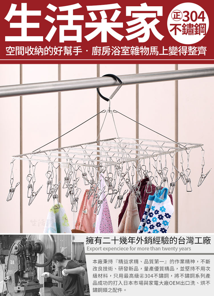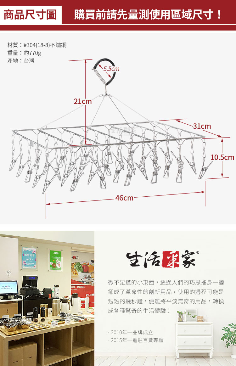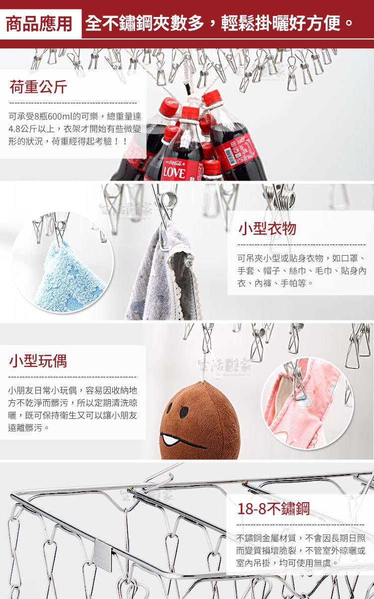 1.尺寸:約長46*寬31*高33cm(展開時) 2.材質:#304(18-8)不鏽鋼 3.重量:約770g(入) 4.產地:台灣 5.夾數:35夾 6.應用:小型衣物室內、外晾曬使用