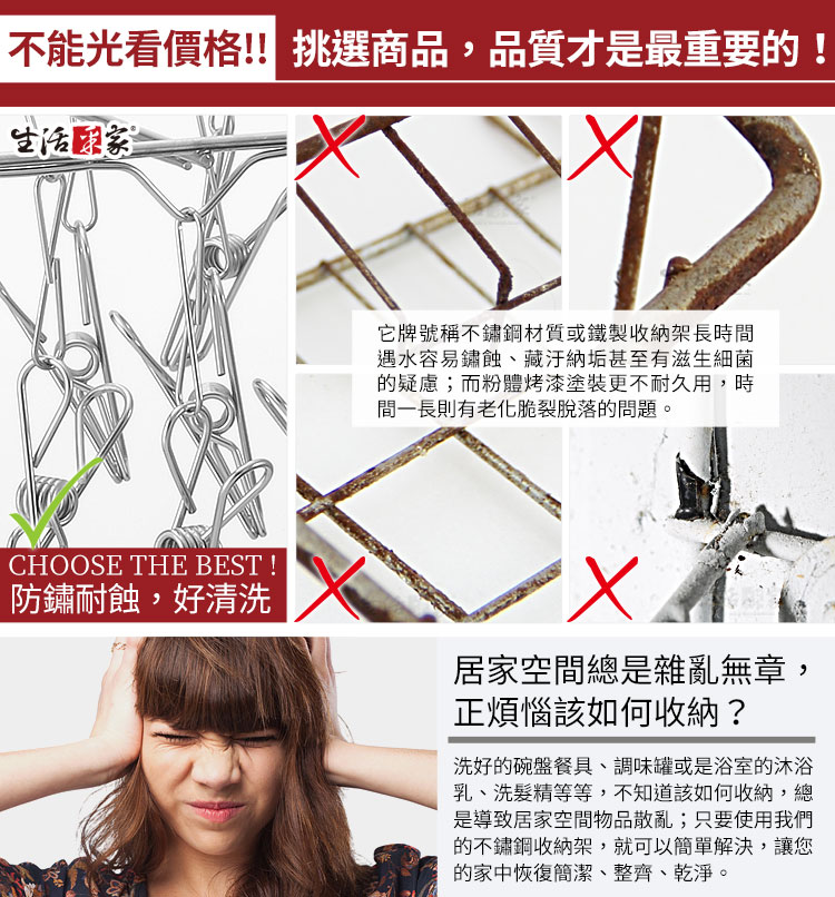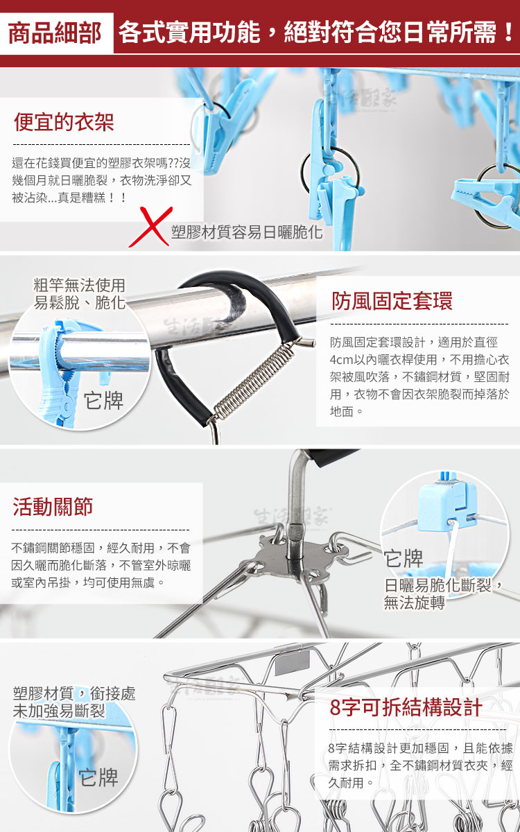 還在買199元的塑膠曬衣架嗎?沒一個月就日曬脆裂,真糟糕!! ◆台灣製商品非大陸製品,作工細緻。 ◆曬衣架上方掛勾處加裝防滑塑膠套管,風大時也不易滑動。 ◆夾數多,即使是個人高用量或全家人的用量也不怕,輕鬆掛曬好方便。 ◆夾數:35夾,適用於高用量用戶,可掛曬各式襪類、衣物、手套、領巾等。 ◆採18-8不鏽鋼材質,不會生鏽,容易清洗保養,經久耐用。 ◆不鏽鋼材不電鍍,表面不鏽鋼抛光,長保如新,衛生可靠。 ◆全架採不鏽鋼材質,不會因日照變質損壞脆裂, 使用壽命更長。 ◆掛勾處的不鏽鋼彈簧可拉開或掛上,防止掛在曬衣桿上時大風吹落。