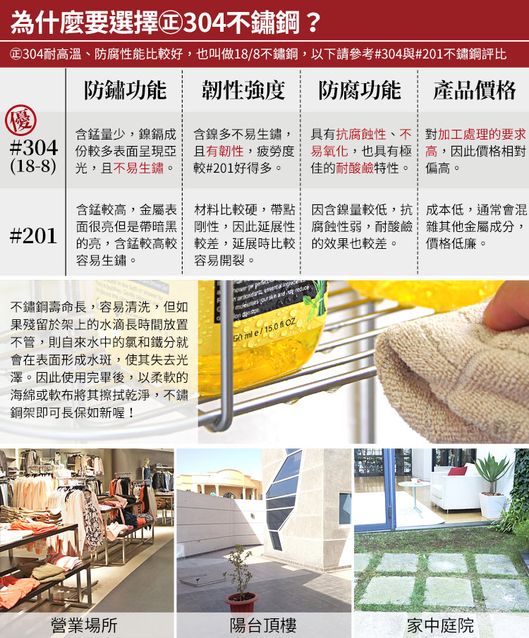 ※SUS304材質,可抗日曬無遇水生鏽問題,SUS304為同質產品最高規格材料,一般不標示材料序號的坊間產品大多是以SUS201或較低階不鏽鋼材所生產的唷~