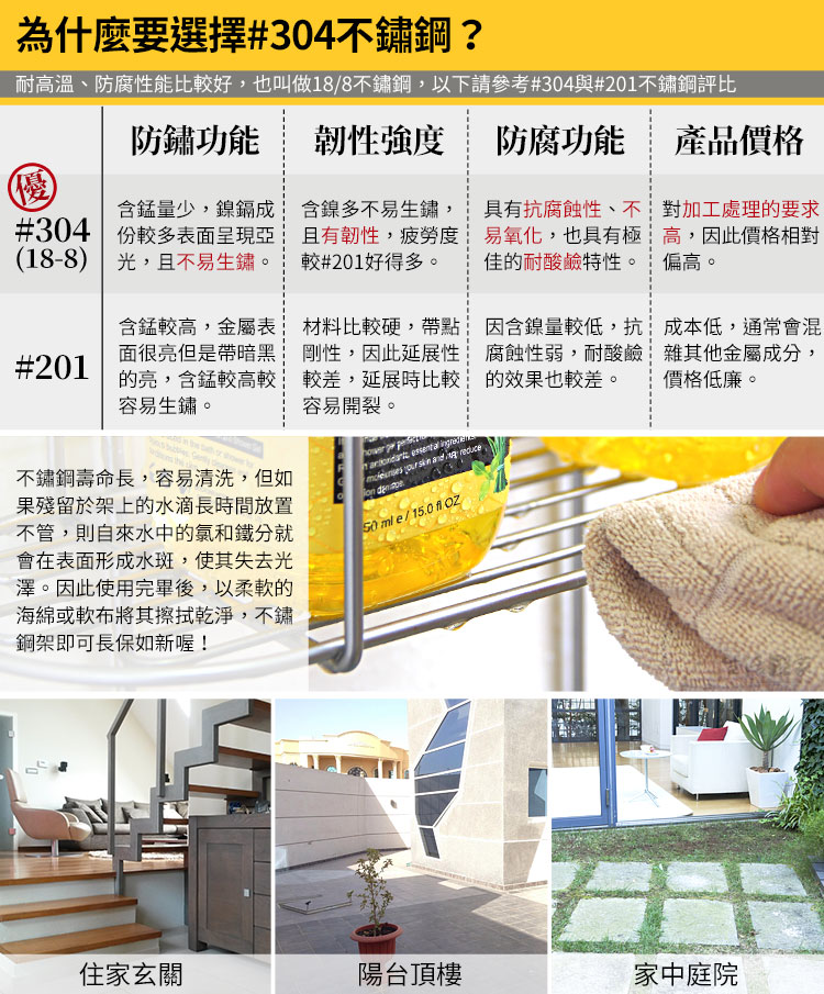 ※SUS304材質,可抗日曬無遇水生鏽問題,SUS304為同質產品最高規格材料,一般不標示材料序號的坊間產品大多是 以SUS204較低階不鏽鋼材所生產的唷~