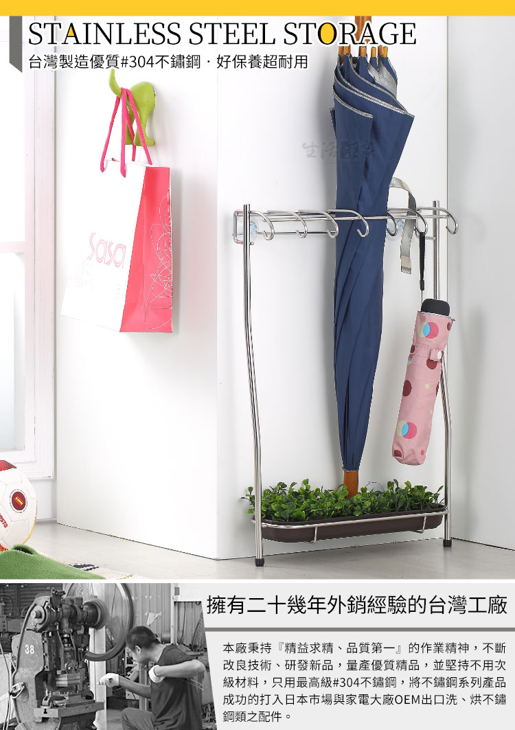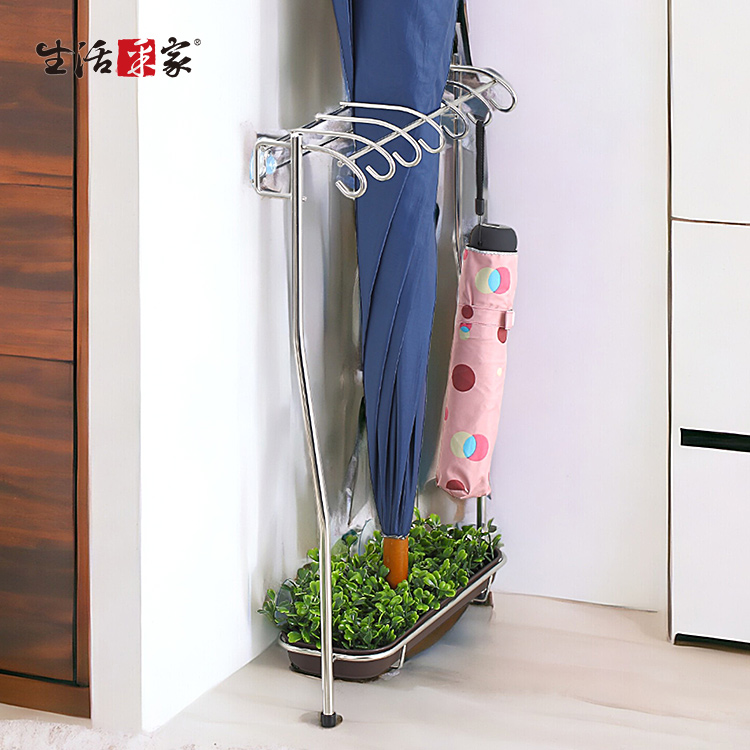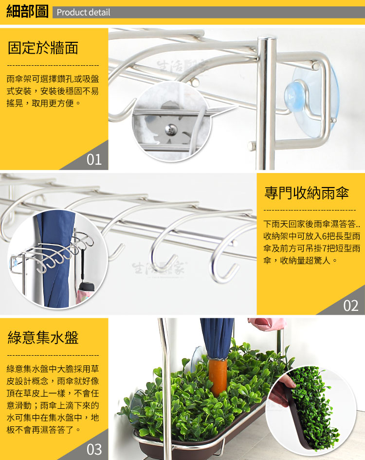 下雨天回家後雨傘只能放在外面滴水,不小心還會被別人「借走」,真是傷腦筋??? ◆綠意與生活用品的結合,塑造多層次的生活品味。 ◆採18-8不鏽鋼材質,不會生鏽,容易清洗保養,經久耐用。 ◆不鏽鋼材不電鍍,表面不鏽鋼抛光,長保如新,衛生可靠。 ◆全架採不鏽鋼材質,不會因日照變質損壞脆裂, 使用壽命更長。 ◆鑽孔式或吸盤式安裝選擇,安裝後穩固不易搖晃,取用更方便。 ◆獨特窄身造型規劃,空間非常節省,甚至可放置於門後的空間使用。 ◆收納架中可放入6把長型雨傘,可吊掛7把短型雨傘,收納量超驚人。 ◆收納架有架腳,搭配吸盤或螺釘安裝可服貼於牆面並以架腳支撐重量,無承重顧慮。 ◆綠意集水盤中大膽採用草皮設計概念,雨傘就好像頂在草皮上一樣,不會任意滑動。 ◆集水盤集水功能,即使下雨天回家也可馬上將雨傘放入收納架中,家裡不會再濕答答的。 ◆可裝在大門、玄關、鞋櫃邊等地使用,平時也當成雨傘的收納處,美觀大方,不必塞在倉庫或浴室了!!