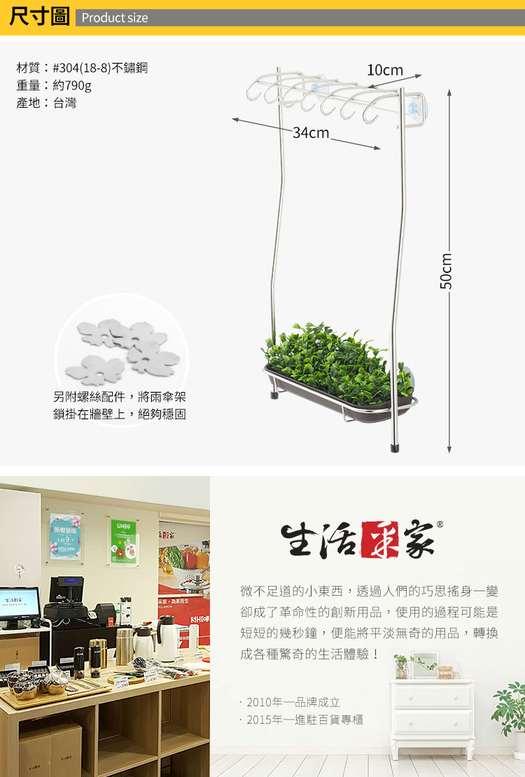 1.尺寸:約W34*L10*H50cm 2.材質:#304(18-8)不鏽鋼 3.重量:約790g/組 4.產地:台灣 5.商品:二用雨傘收納架*1、塑膠水盤*1、人工草*1、吸盤*4、螺釘花片組*2