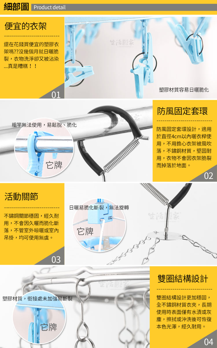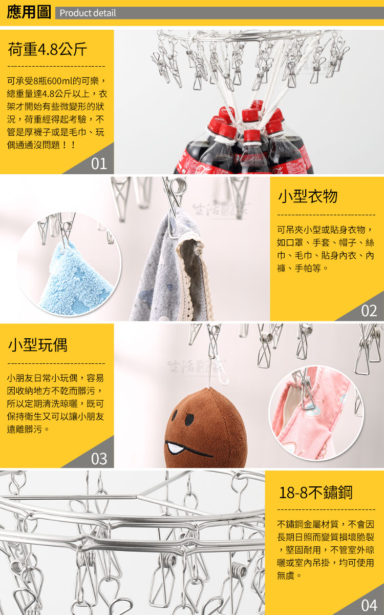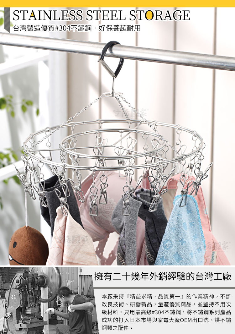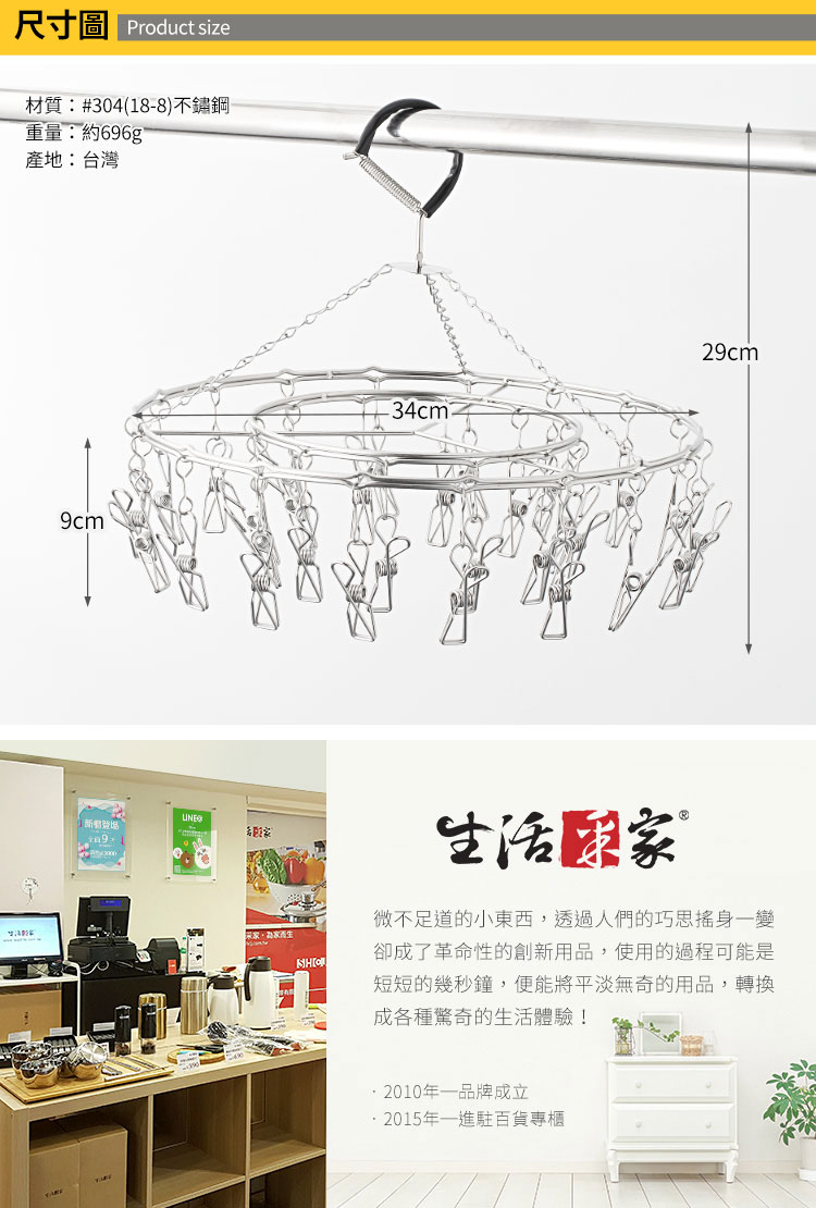 1.尺寸:約直徑34cm 2.材質:#304(18-8)不鏽鋼 3.重量:約696g(入) 4.產地:台灣 5.夾數:30夾 6.商品:室外30夾曬衣吊掛架*1
