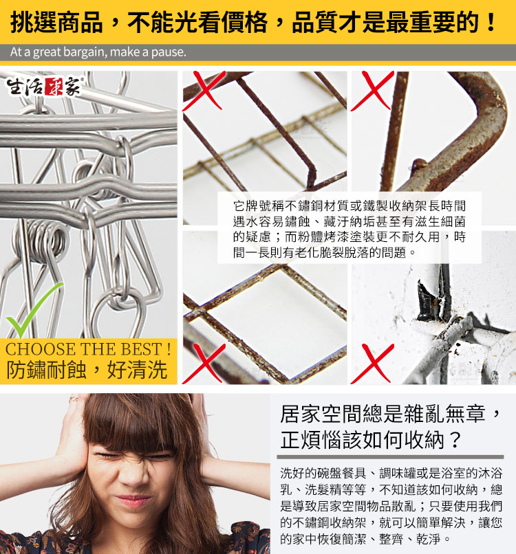 還在買199元的塑膠曬衣架嗎?沒一個月就日曬脆裂,真糟糕!! ◆採18-8不鏽鋼材質,不會生鏽,容易清洗保養,經久耐用。 ◆不鏽鋼材不電鍍,表面不鏽鋼抛光,長保如新,衛生可靠。 ◆全架採不鏽鋼材質,不會因日照變質損壞脆裂, 使用壽命更長。 ◆夾數:30夾,適用於高用量用戶,可掛曬各式襪類、衣物、手套、領巾等。 ◆夾數多,即使是個人高用量或全家人的用量也不怕,輕鬆掛曬好方便。 ◆曬衣架上方掛勾處加裝防滑塑膠套管,風大時也不易滑動。 ◆掛勾處的不鏽鋼彈簧可拉開或掛上,防止掛在曬衣桿上時大風吹落。