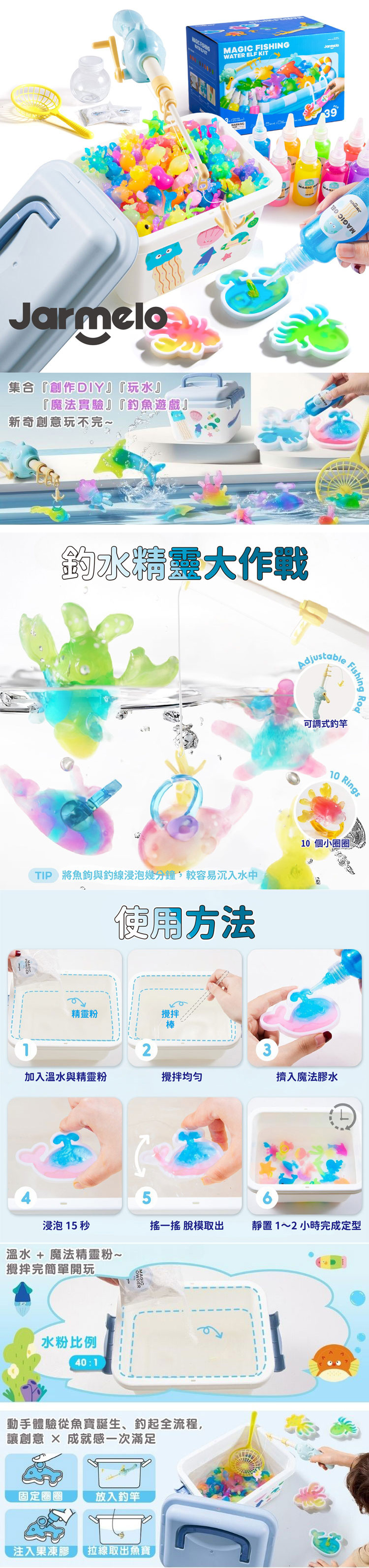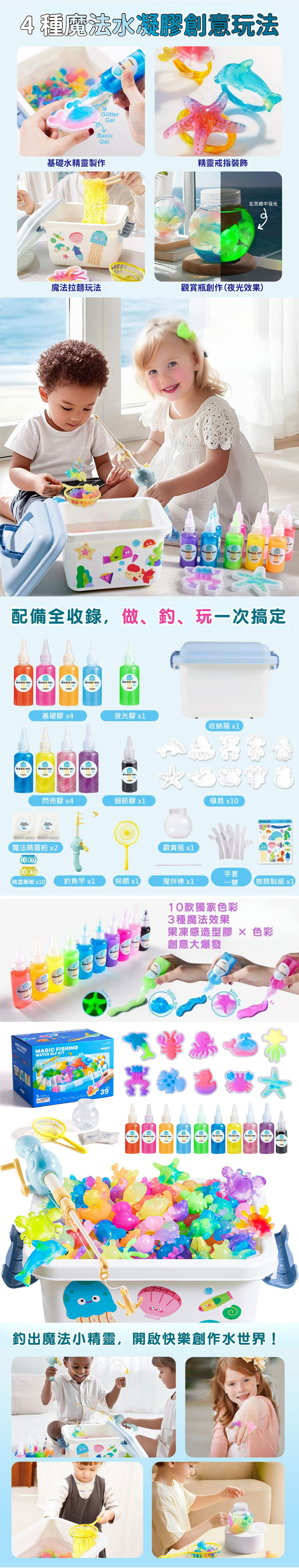 【品名】魔法水凝膠釣釣樂 DIY創作盒 【主要材質】無毒顏料、乳酸鈣、塑膠 【年齡】3歲以上 【尺寸】28 x19.1 x11 公分 【重量】1505g 公克 【產地】中國 【安全標章】CE, AP 【BSMI】M33851