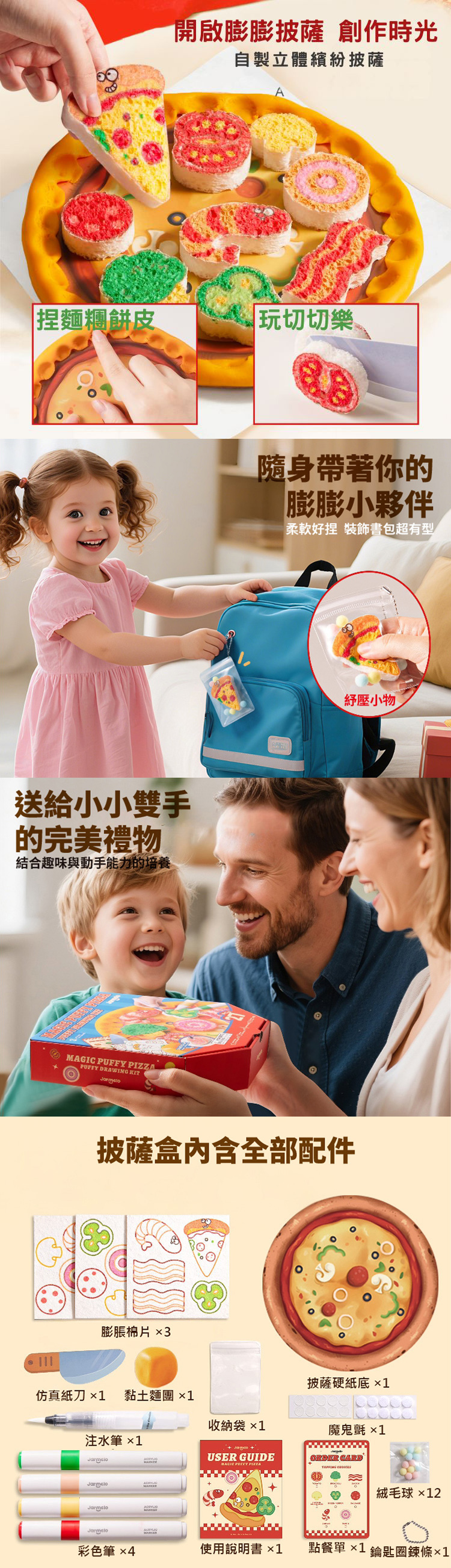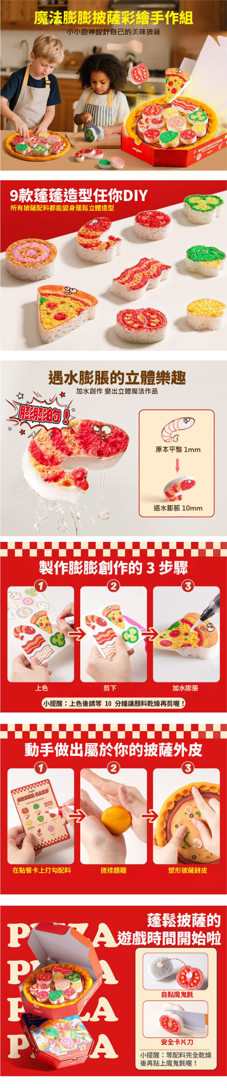 令孩子驚奇的「膨膨披薩」手作禮來囉!結合藝術與科學,觀察棉片遇水膨脹,樂趣看得見~ 用黏土捏出餅皮,還原擬真烘焙場景 Pizza 盒造型包裝,再來一場家家酒 動手將批薩食材『上色、剪下、加水』製出來~ 1 mm 棉片瞬間膨成 10 mm 立體配料,模擬各式食材厚度 全套配件一盒搞定,親子同樂、手作教具、生日禮物都適合 【安全標章】CE, AP