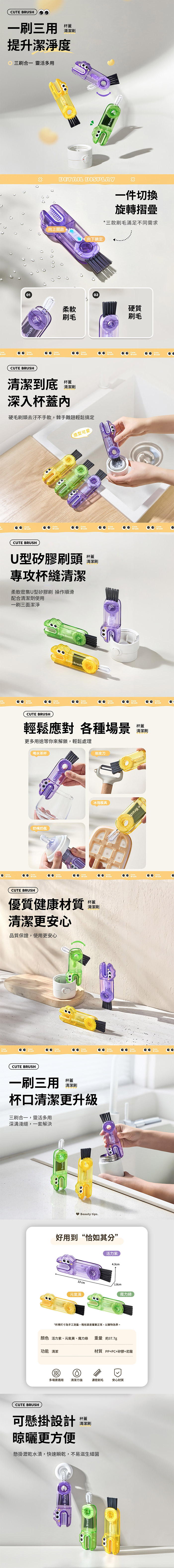 三刷合一,靈活多用 U型柔軟刷齒,清潔杯口頑固污漬 雙排硬毛直刷,強力除垢,凹槽不藏汙 360度旋轉切換刷頭與卡扣設計,清潔更便利 高密度螺旋刷,深入縫隙,無死角去除污垢