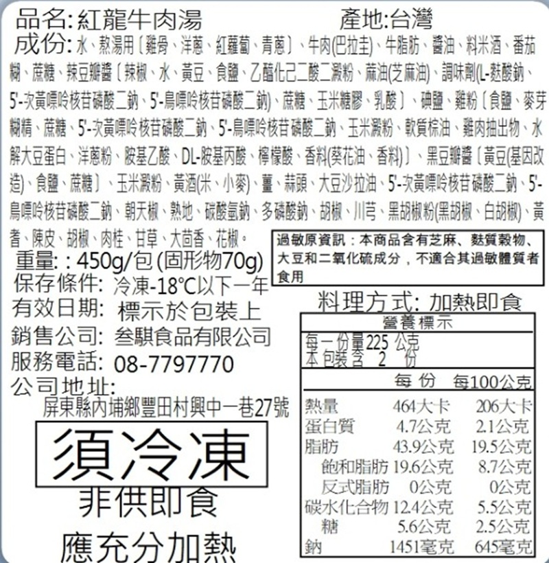 商品名稱:紅龍牛肉湯 商品成分:水、熬湯用〔雞骨、洋蔥、紅蘿蔔、青蔥〕、牛肉(巴拉圭)、牛脂肪、醬油、料米酒、番茄糊、蔗糖、辣豆瓣醬〔辣椒、水、黃豆、食鹽、乙醯化己二酸二澱粉、蔴油(芝麻油)、調味劑(L-麩酸鈉、5'-次黃嘌呤核苷磷酸二鈉、5'-鳥嘌呤核苷磷酸二鈉)、蔗糖、玉米糖膠、乳酸〕、碘鹽、雞粉〔食鹽、麥芽糊精、蔗糖、5'-次黃嘌呤核苷磷酸二鈉、5'-鳥嘌呤核苷磷酸二鈉、玉米澱粉、軟質棕油、雞肉抽出物、水解大豆蛋白、洋蔥粉、胺基乙酸、DL-胺基丙酸、檸檬酸、香料(葵花油、香料)〕、黑豆瓣醬〔黃豆(基因改造)、食鹽、蔗糖〕、玉米澱粉、黃酒(米、小麥)、薑、蒜頭、大豆沙拉油、5'-次黃嘌呤核苷磷酸二鈉、5'-鳥嘌呤核苷磷酸二鈉、朝天椒、熟地、碳酸氫鈉、多磷酸鈉、胡椒、川芎、黑胡椒粉(黑胡椒、白胡椒)、黃耆、陳皮、胡椒、肉桂、甘草、大茴香、花椒。 商品規格:450g/包 (固形物70g) 保存期限:冷凍-18℃以下1年(請依包裝上標示為主) 調理方式:加熱即食 原生產地:台灣 保存方法:冷凍保存 配送方式:全程低溫-18°C冷凍車配送 過敏原資訊:本商品含有芝麻、麩質穀物、大豆和二氧化硫成分,不適合其過敏體質者食用 國內負責廠商名稱:叁騏食品有限公司 國內負責廠商地址:屏東縣內埔鄉豐田村興中一巷27號 國內負責廠商電話:08-7797770 食品業者登錄字號:T-153474322-00000-7 產品責任險:本公司產品已投保富邦產物產品責任險新台幣壹仟萬元