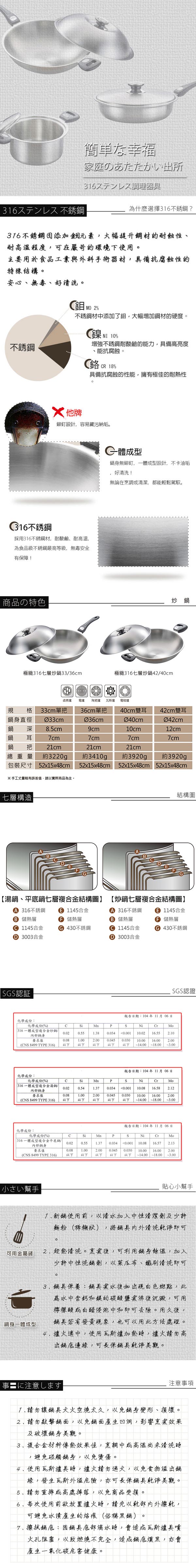 材質:鍋身-內層316不銹鋼、外層430不銹鋼 鍋蓋-304不銹鋼、電木珠頭 把手-鍋耳-電木 使用方法: 1.使用前以水和少許麵粉(稀糊狀)與清潔劑清洗,清洗乾淨後即可使用。 2.如過度刷洗,造成表面殘餘黑色不銹鋼成分,請以軟質布面或海綿再清洗一次即可。 3.烹調後如出現白色斑點或是彩虹紋,此為澱粉和水中礦物質所形成之正常現象,可用不銹鋼專用清潔劑浸泡後洗淨。 4.鍋身如有變黃,可能是因為火太大造成油、調味料粘附鍋身,可用不銹鋼專用清潔劑浸泡後洗淨。 保存方法:商品使用完敬請擦乾並保存於通風乾燥處,避免與強酸、鹼性溶劑共同存放,以免造成商品銹蝕。 注意事項: 1.請勿讓鍋具大火空燒過久,以免鍋身變質或變形、損壞。 2.請勿敲擊鍋面,以免鍋面產生凹洞,影響烹煮效果及破壞鍋身美觀。 3.烹調中或高溫尚未清洗時,避免碰觸鍋身,以免燙傷。 4.使用瓦斯爐具時,爐火請勿過大以免食物溢出鍋緣,發生瓦斯外溢危險,亦可常保鍋具乾淨美觀。
