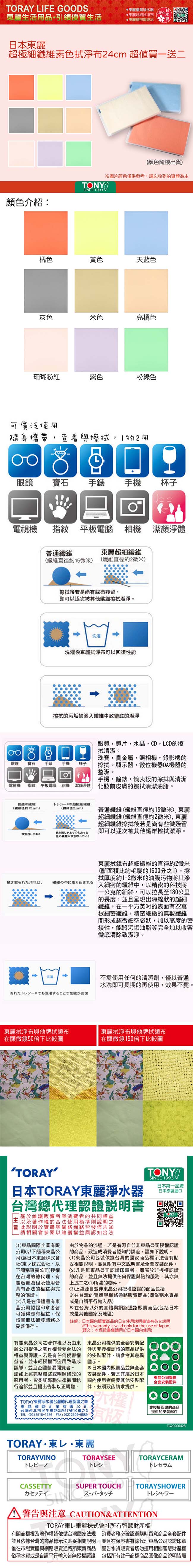 日本東麗 超極細纖維素色拭淨布24cm超值買一送二(顏色隨機出貨)TS-24x24*3 總代理貨品質保證 東麗拭淨布超細纖維的直徑約2微米(斷面積比約毛髮的1600分之1),擦拭厚度約1~2微米的油膜污物將其滲入細密的纖維中,可拉長至180公里的長度,並且呈現出海綿狀的超細纖維,在平方英吋的表面有22萬根細密纖維,精密細緻的無數纖維間形成超微細空袋狀,加以高度的密接性,能將污垢油脂等完全徹底清除致潔淨 ■ 廣泛的多種用途 ■ 眼鏡、鏡片、水晶、CD、LCD、珠寶、貴金屬、照相機鏡頭、手機螢幕...等擦拭清潔 ■ 也可用於化妝前皮膚的擦拭油脂 ■ 交叉表面的凹凸狀容易與手溶接,擦拭時部會滑溜 ■ 擦拭後光潔的表面不會殘留細紋跟損傷 ■ 東麗拭淨布超細纖維的直徑約2微米(斷面積比約毛髮的1600分之1) ■ 如蠶絲般的細柔,因為具有長纖維特性,絕無絲屑掉落或起毛球的現象 ■ 非一般短纖維或不織布,因此擦拭後的表面光潔亮麗 ■ 不需要使用任何清潔劑,僅以清水即可長期使用,效果不變 ■ 可輕鬆將指紋擦拭乾淨 ■ 體積輕薄好攜帶 ■ 沾水濕擦玻璃也不殘留毛屑 ※為避免損傷擦拭物的表面,請在使用前先去除較大汙物或雜質,再使用拭淨布 ※若是需要整燙時,請依據JIS規格溫度(80-120℃) ※拭淨布為個人清潔衛生用品,請務必注意拆封後即不可退換貨!