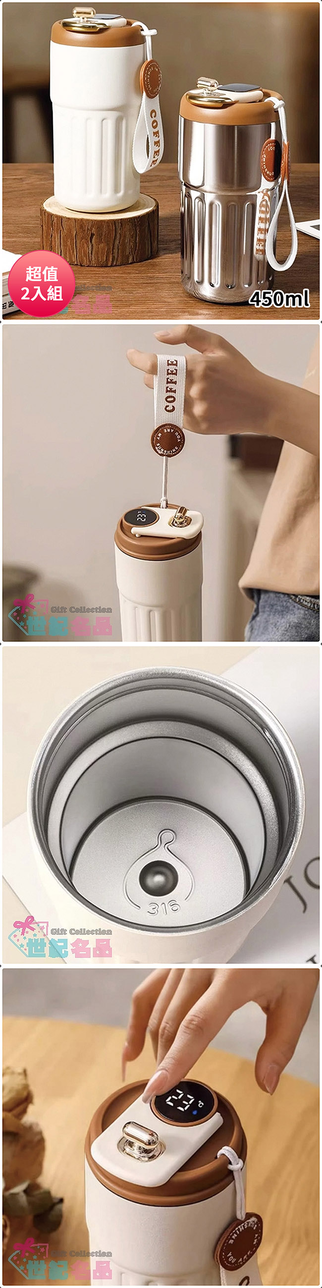 DOLEE 304不鏽鋼經典智能溫顯咖啡杯450ml(顏色隨機出貨) W90 超值2入組 ■ 304不鏽鋼+316不鏽鋼內膽 ■ 智能溫顯,飲用不燙嘴 ■ 長效保溫保冷 ■ 直飲杯口,飲用方便 ■ 有杯口鎖設計,收納不漏水 ■ 提帶設計,攜帶便利 ■ 自用送禮都適用 ■ 環保愛地球