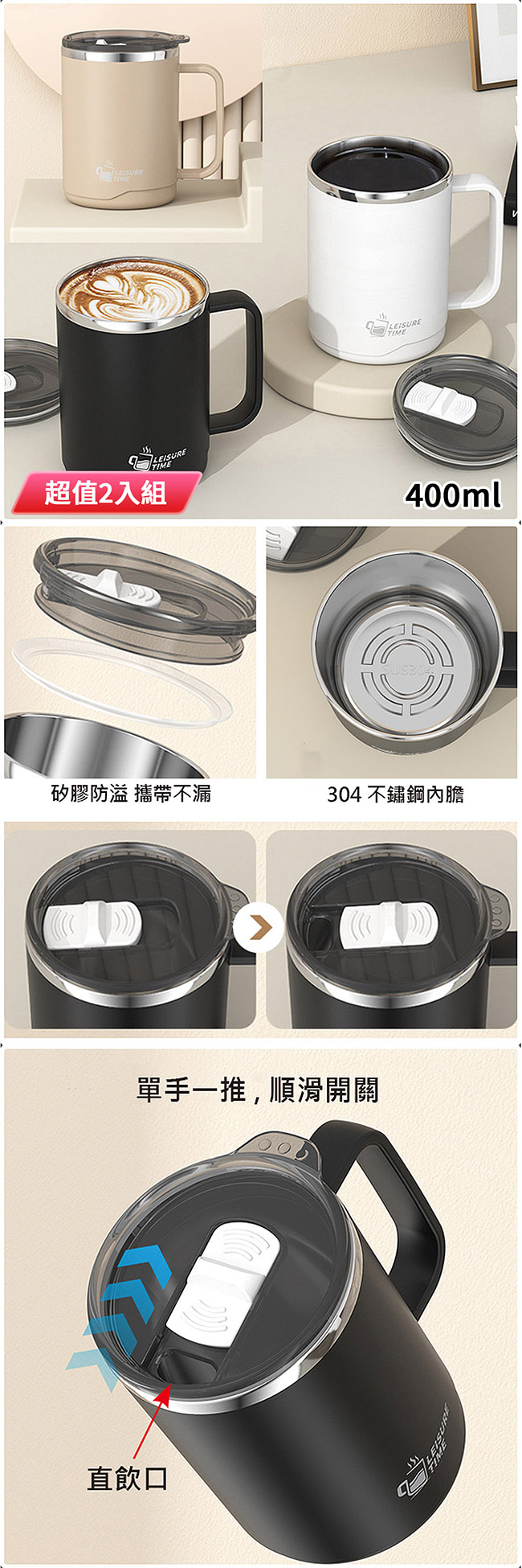 DOLEE 304不鏽鋼附蓋馬克杯400ml(顏色隨機出貨) W14 超值2入組 ■ 304不鏽鋼內膽 ■ 長效保溫保冷 ■ 矽膠圈防溢,攜帶不漏 ■ 直飲杯口,單手一推、順滑開關,飲用方便 ■ 適用居家、外出、辦公室等場合 ■ 自用送禮都適用 ■ 環保愛地球
