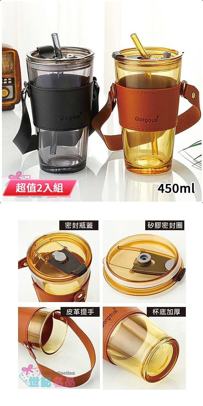 DOLEE 時尚手提玻璃二用杯450ml(顏色隨機出貨) GS01 超值2入組 ■ 密封瓶蓋 ■ 矽膠密封圈防溢 ■ 直飲口和玻璃吸管飲用方便 ■ 皮革提手設計,攜帶便利 ■ 杯底加厚 ■ 自用送禮都適用 ■ 環保愛地球