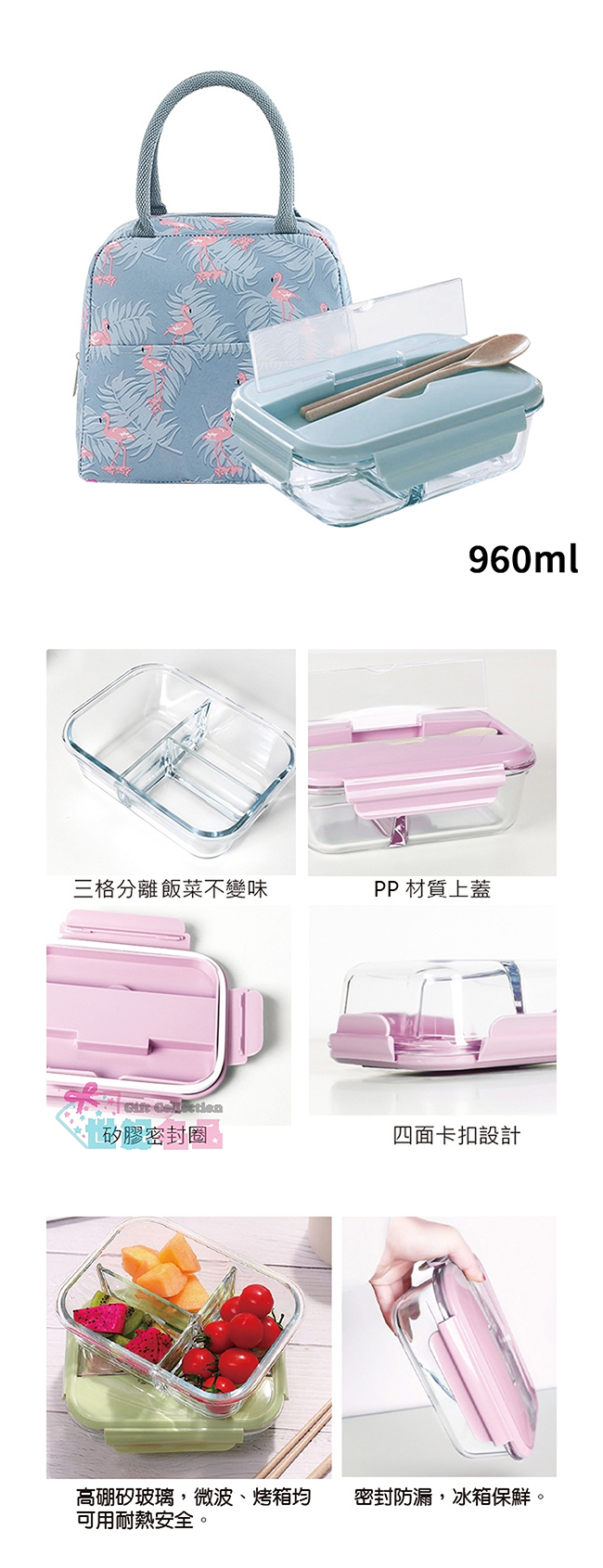 DOLEE 保溫袋三分隔玻璃保鮮盒組960ml附餐具(顏色隨機出貨) GS18 ■ 三格分離,飯菜不變味 ■ 四面卡扣設計 ■ 密封防漏,冰箱保鮮 ■ 高硼矽玻璃,微波、烤箱均可用,耐熱安全 ■ 附餐具(筷+匙) ■ 附保溫袋,外出攜帶更方便 ■ 自用送禮都適用 ■ 自備餐盒,環保愛地球