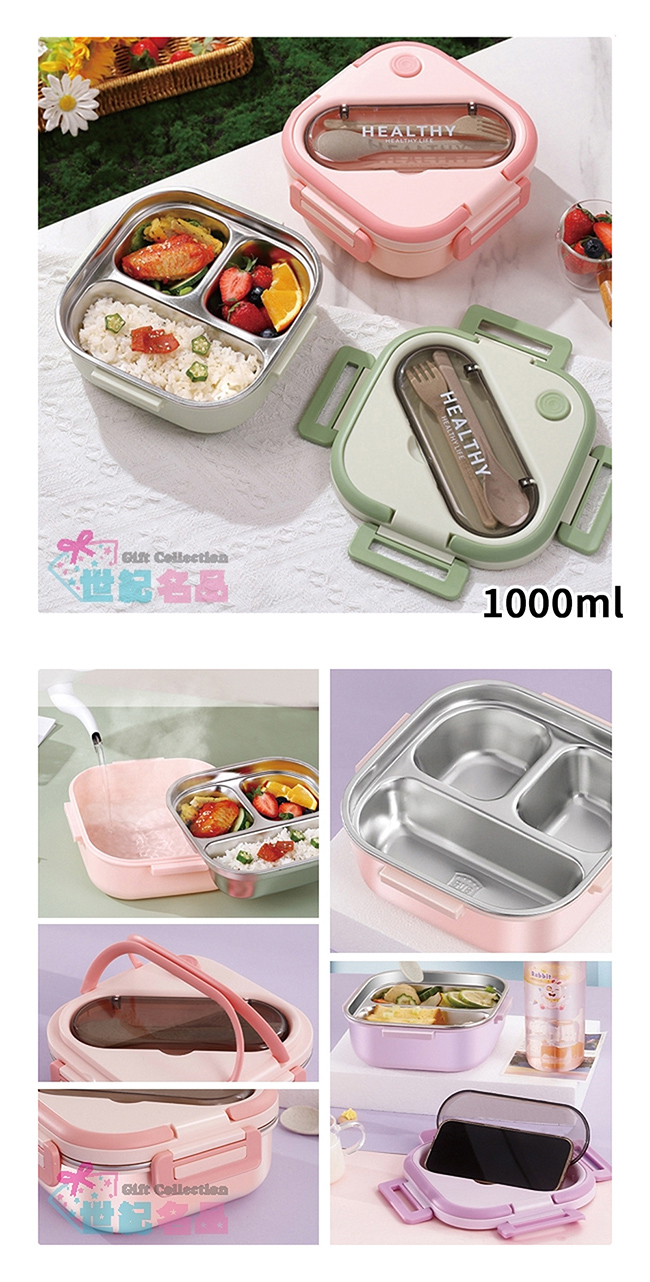 DOLEE 304不鏽鋼手提餐盒1000ml附餐具(顏色隨機出貨) WT5 ■ 三格分離,飯菜不變味 ■ 四面卡扣設計 ■ 附餐具(叉+匙) ■ 自用送禮都適用 ■ 自備餐盒,環保愛地球 ■ 可添加熱水在PP塑膠盒內,為裝在304不鏽鋼層的食物保溫