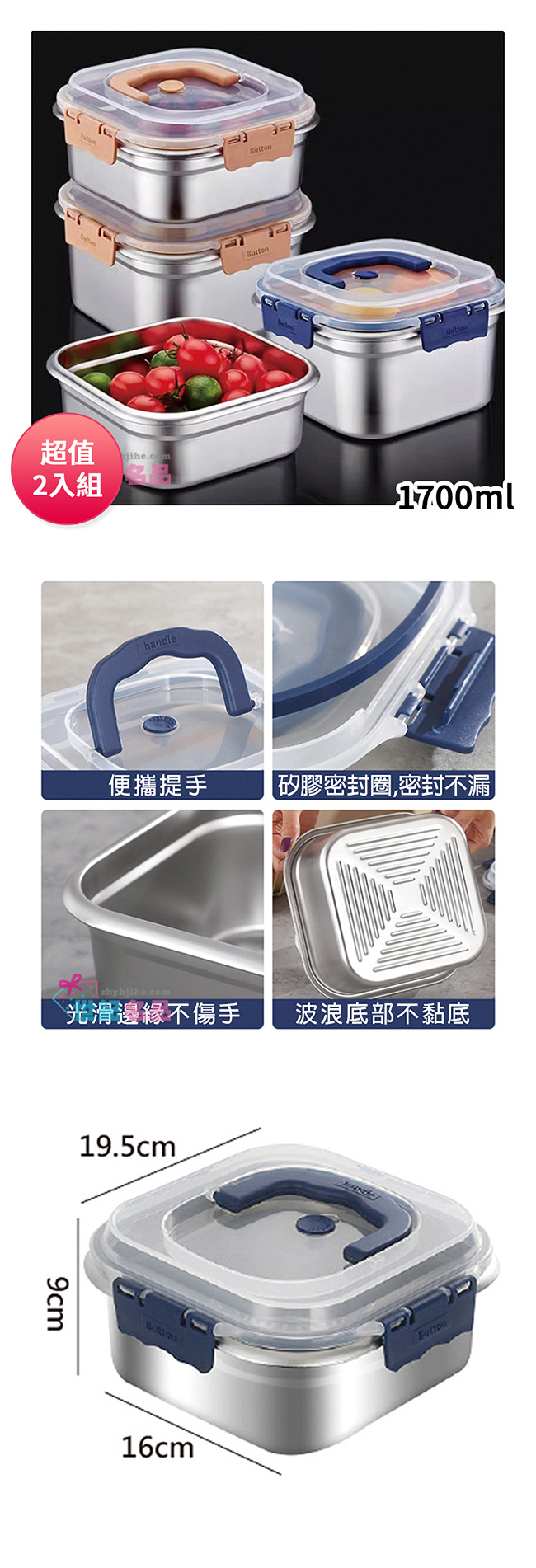 DOLEE 316不鏽鋼手提保鮮盒1700ml WT27 超值2入組 ■ 矽膠蜜封圈,蜜封不漏 ■ 光滑邊緣不傷手 ■ 四面卡扣設計 ■ 便攜提手 ■ 波浪底部不黏底 ■ 自用送禮都適用 ■ 自備餐盒,環保愛地球