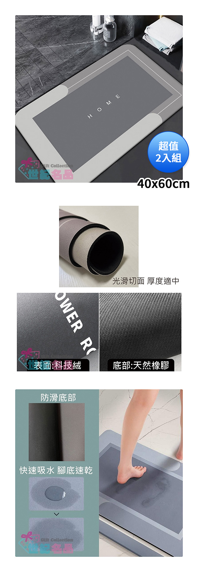 DOLEE 硅藻土吸水地墊40x60cm(顏色隨機出貨) ZA52 超值2入組 ■ 光滑切面,厚度適中 ■ 表面:科技絨 ■ 底部:天然橡膠 ■ 快速吸水,腳底速乾 ■ 防滑底部