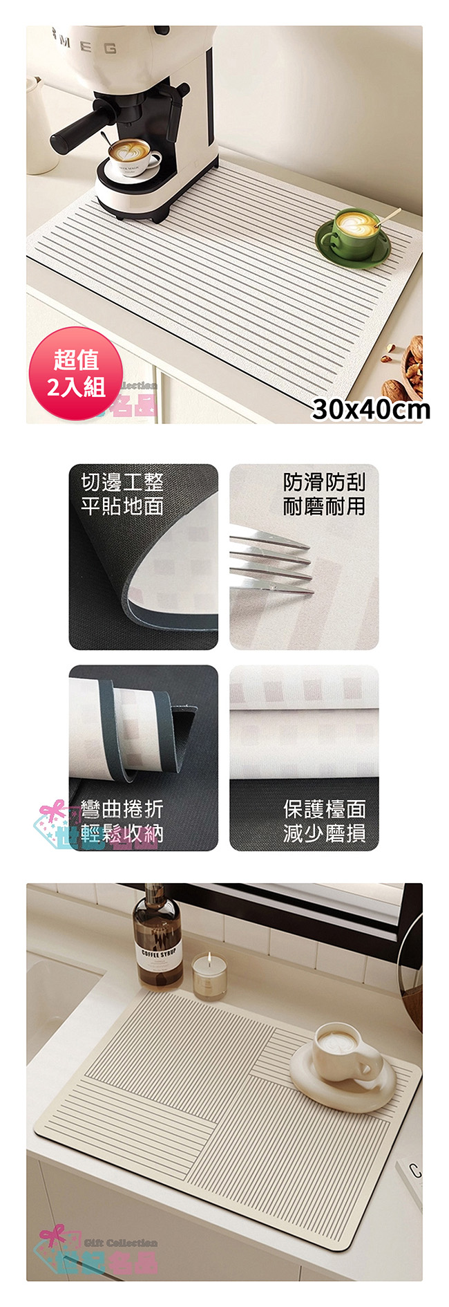 DOLEE 硅藻土廚房吸水桌墊30x40cm(款式隨機出貨) ZA02 超值2入組 ■ 切邊工整,平貼地面 ■ 防滑防刮,耐磨耐用 ■ 彎曲捲折,輕鬆收納 ■ 保護檯面,減少磨損