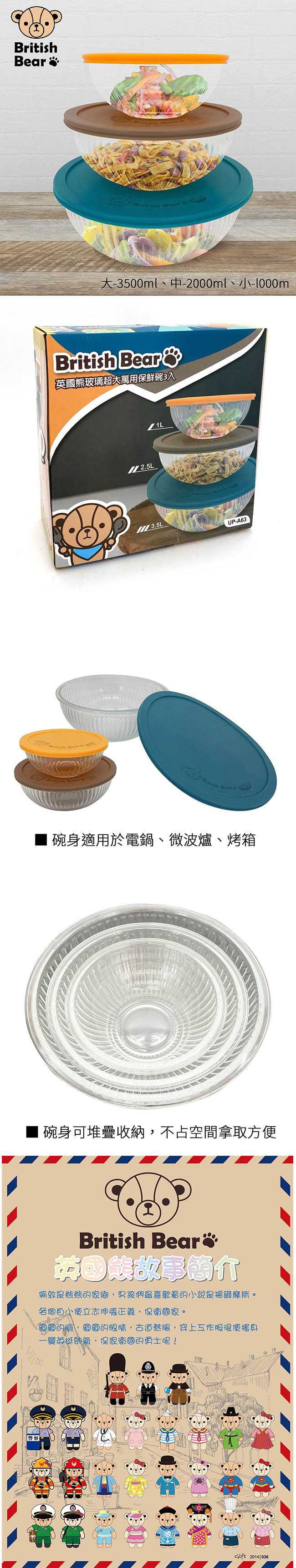 英國熊 玻璃超大萬用保鮮碗3入(盒裝) UP-A63 ■ 耐熱400度高硼矽玻璃材質,耐酸鹼 ■ 碗身可堆疊收納,不使用時不占空間拿取方便 ■ 碗身適用於電鍋、微波爐、烤箱 ■ 易清洗,不殘留氣味及色漬,可替代保鮮膜的重複使用