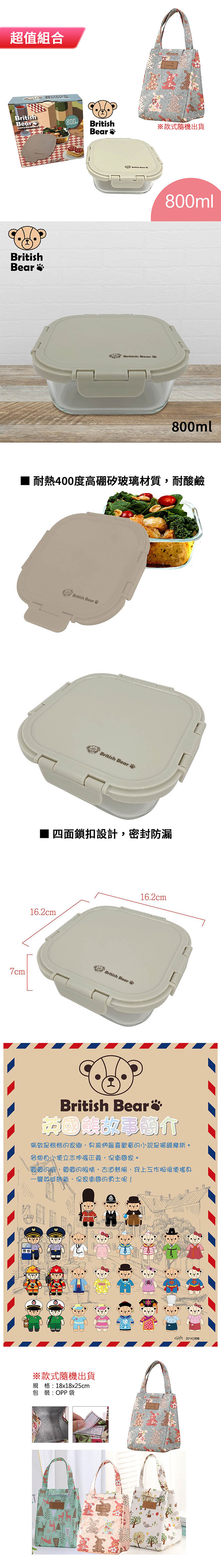 英國熊 耐熱玻璃保鮮盒(奶茶色)800ml UP-E055M+牛津布保溫提袋(款式隨機) EG84 英國熊 耐熱玻璃保鮮盒(奶茶色)800ml UP-E055M ■ 耐熱400度高硼矽玻璃材質,耐酸鹼 ■ 高氣密矽膠條,安全無毒不漏水不漏氣 ■ 四面鎖扣設計,密封防漏 ■ 易清洗,不殘留氣味及色漬 可替代保鮮膜的重複使用 牛津布保溫提袋(款式隨機) EG84 ■ 袋身繽紛可愛圖案 ■ 魔鬼氈黏扣,開啟方便 ■ 內裡鋁箔層,保溫保冷效果佳 ■ 居家、上班上學、野餐都適用