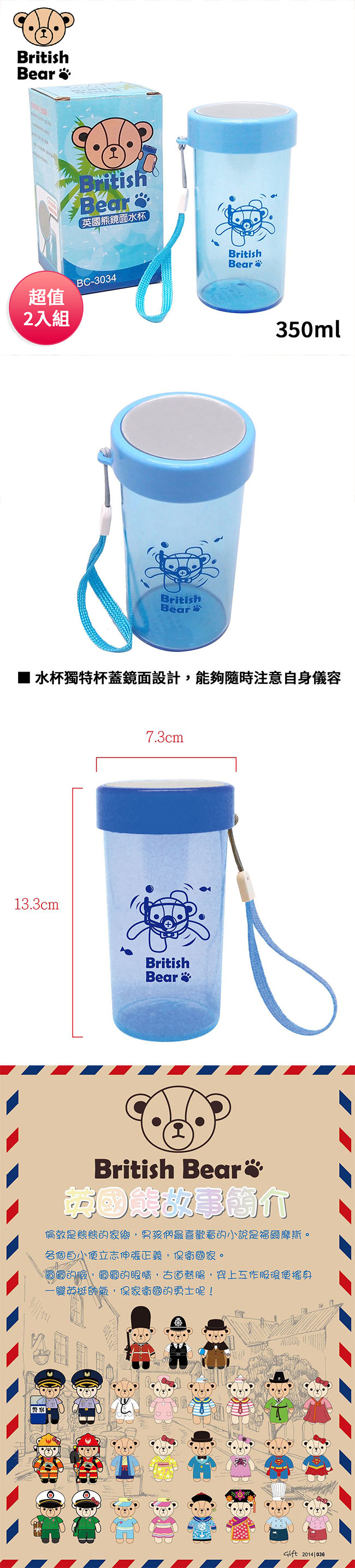 英國熊 鏡面水杯350ml(盒裝) BC-3034 超值2入組 ■ 英國熊授權圖案商品 ■ 水杯獨特杯蓋鏡面設計,能夠隨時注意自身儀容 ■ 透明杯身安全看得見 ■ 提繩設計,可掛可提,方便攜帶 ■ 自備環保杯,環保愛地球