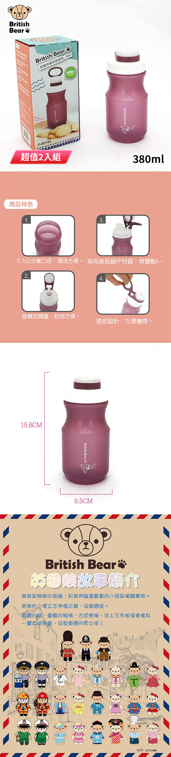 英國熊 環保隨身瓶380ml(盒裝) P-B0188 超值2入組 ■ 英國熊授權圖案商品 ■ 不論在健身房&戶外使用皆適合 ■ 自備水瓶環保愛地球 ■ 瓶身有凹槽設計,符合人體工學,方便好拿取,使用不滑手 ■ 耐熱矽膠密封不外漏,旋蓋式水瓶,飲用方便,不用擔心瓶蓋不見 ■ 貼心提把設計,攜帶方便 ■ 5cm廣口設計,方便清洗,冰塊也可輕鬆放入
